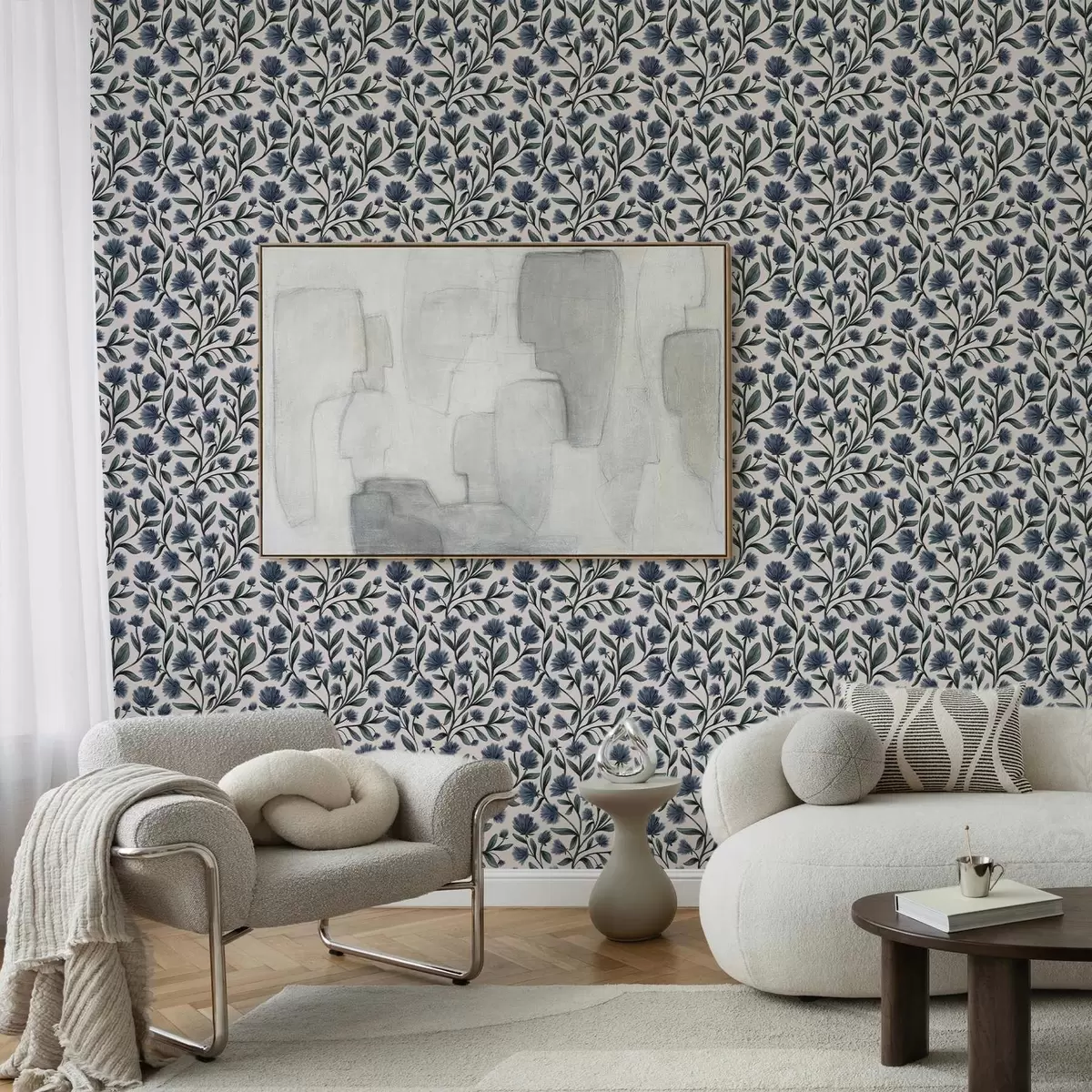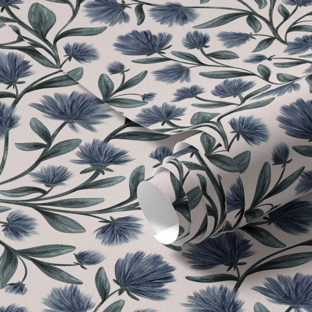 Tapeta Divje rože v modro-zeleni barvni paleti na kremastem ozadju Št. a00623v2
