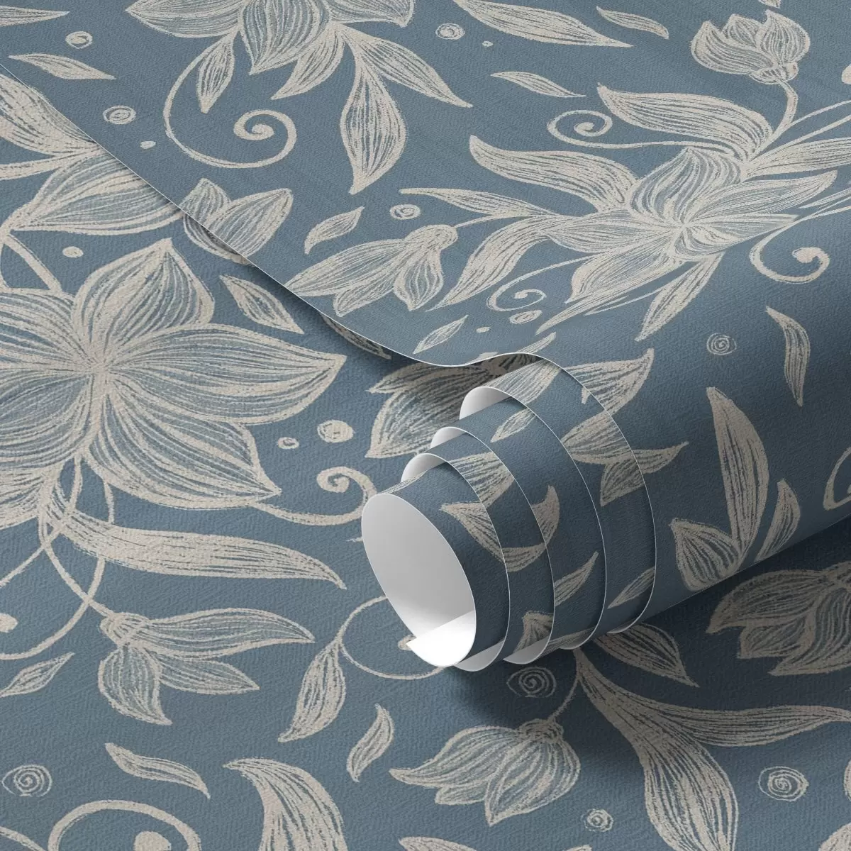 Tapeta Kremaste linearne cvetlice na modrem ozadju, nežni voluti Št. a00630