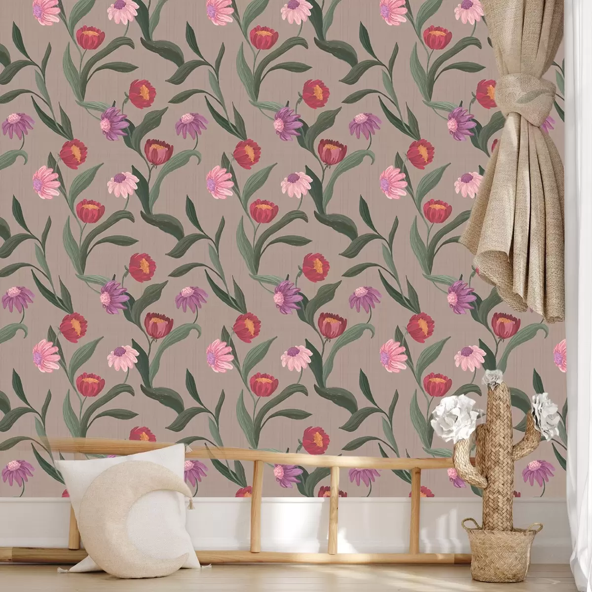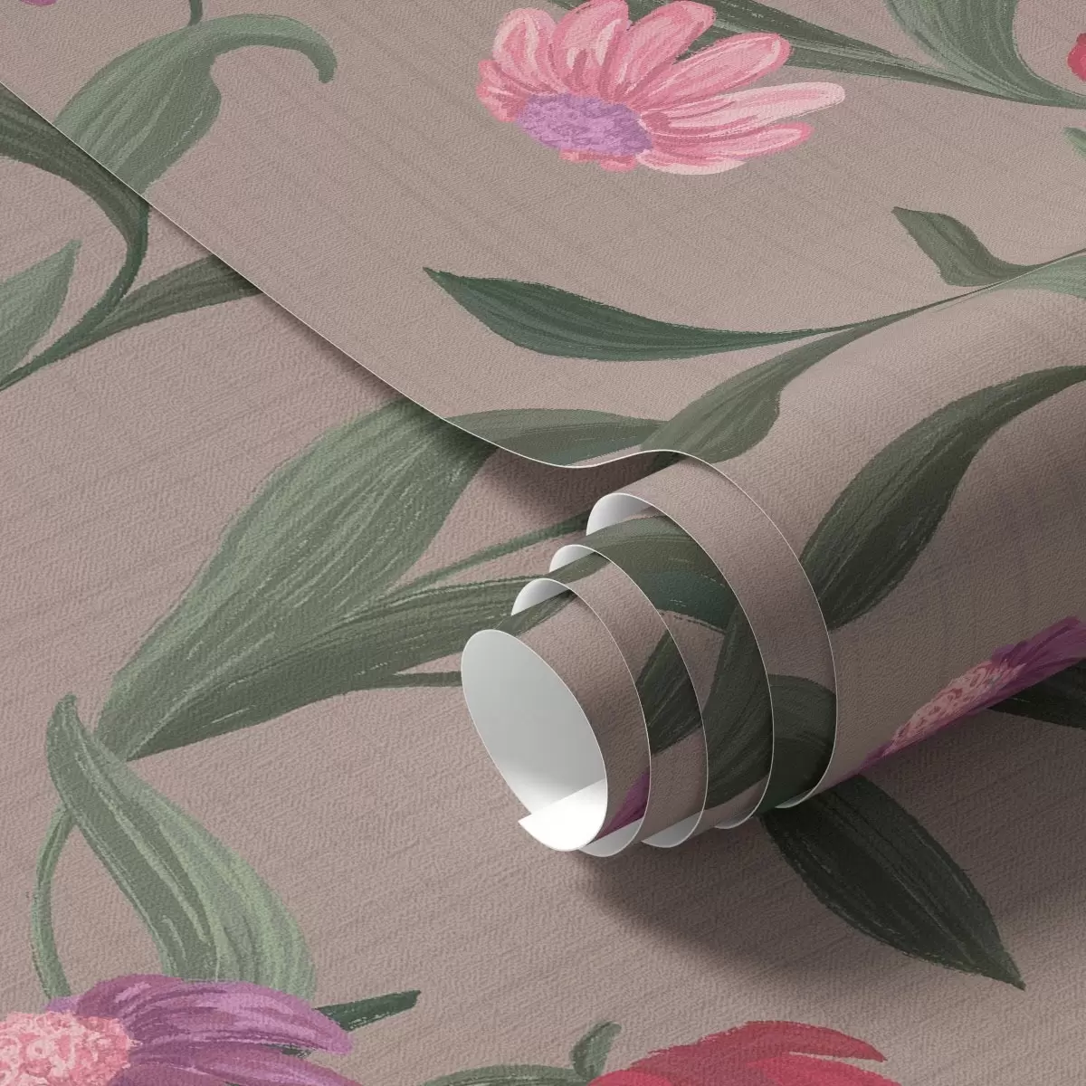 Tapeta Rožnato-rdeči cvetovi na sivi podlagi, dolga stebla Št. a00631v2