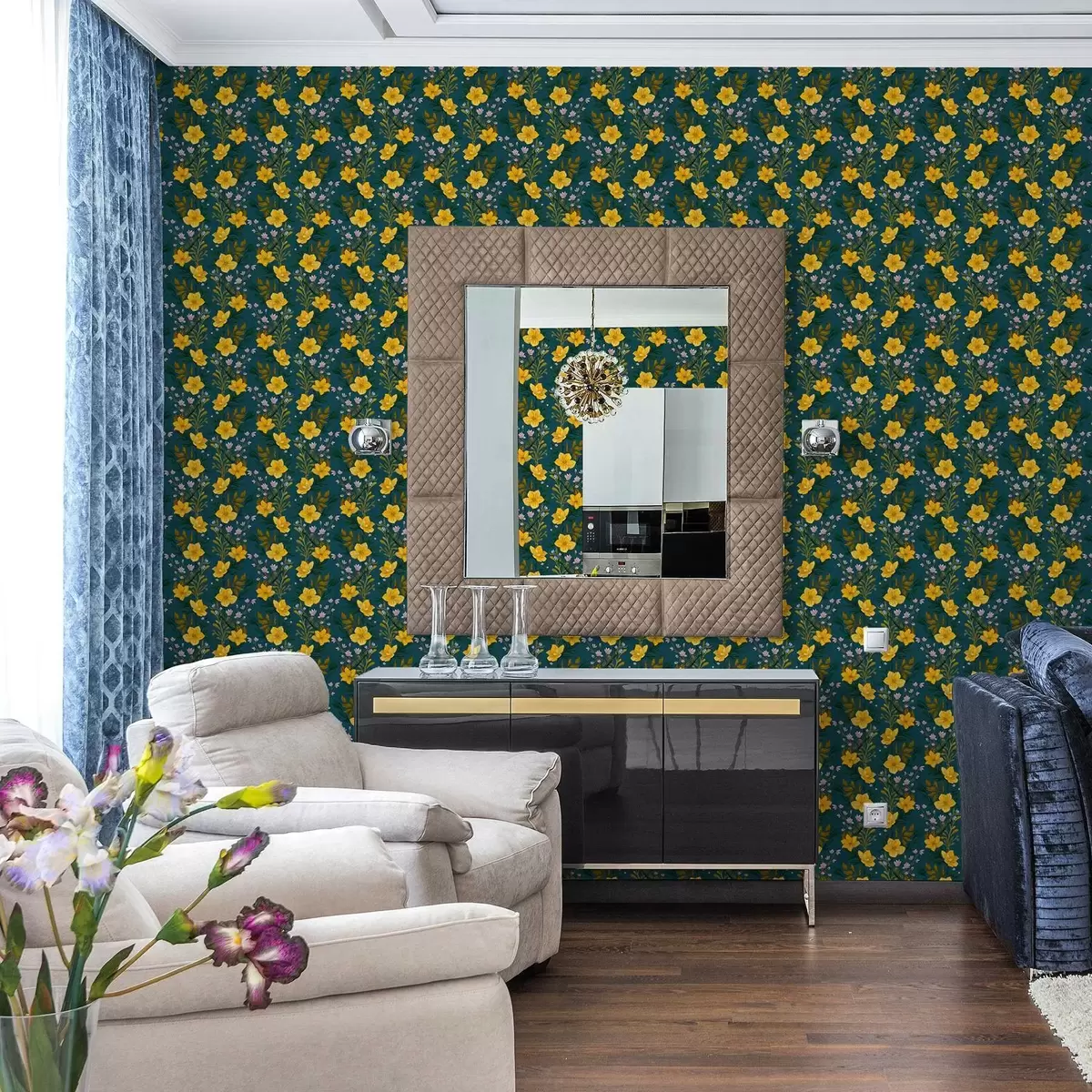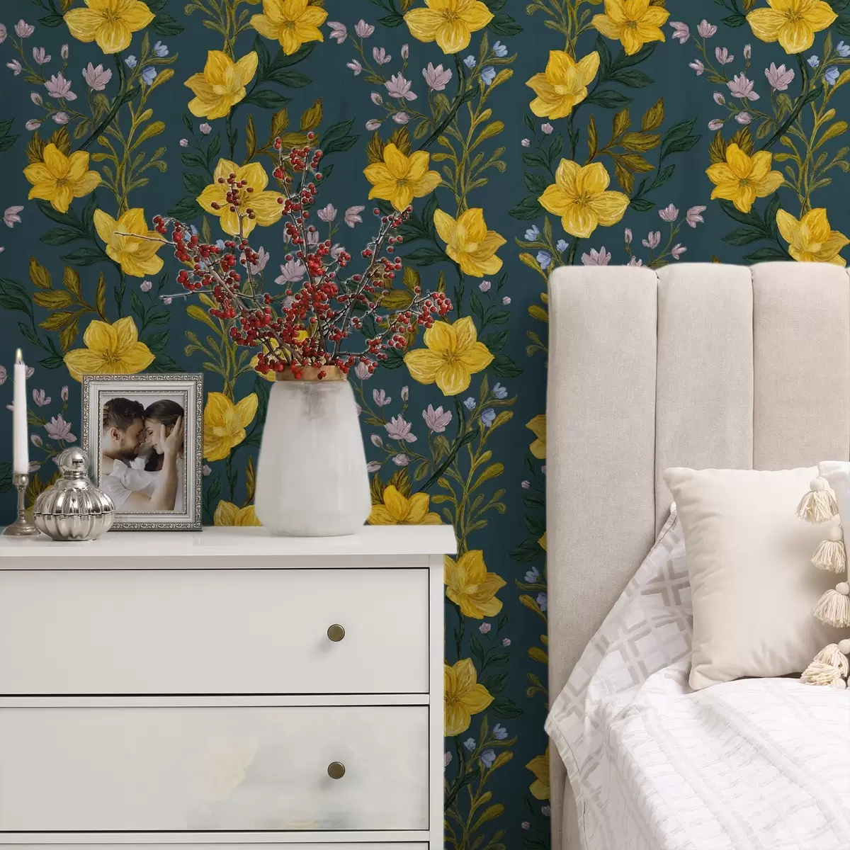 Tapeta Rumene cvetlice v navpičnih girlandah na temno modrem ozadju Št. a00632v2