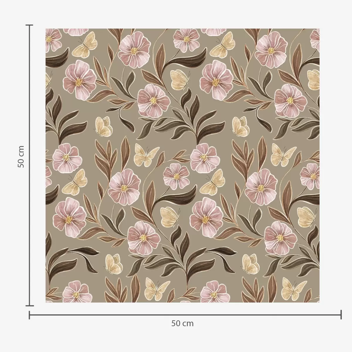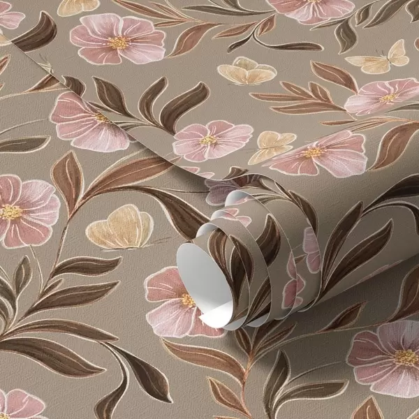 Tapeta Rožnate cvetlice in metulji na olivno-bežnem ozadju Št. a00633v2