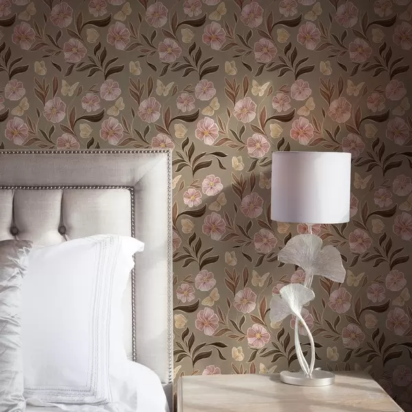 Tapeta Rožnate cvetlice in metulji na olivno-bežnem ozadju Št. a00633v2