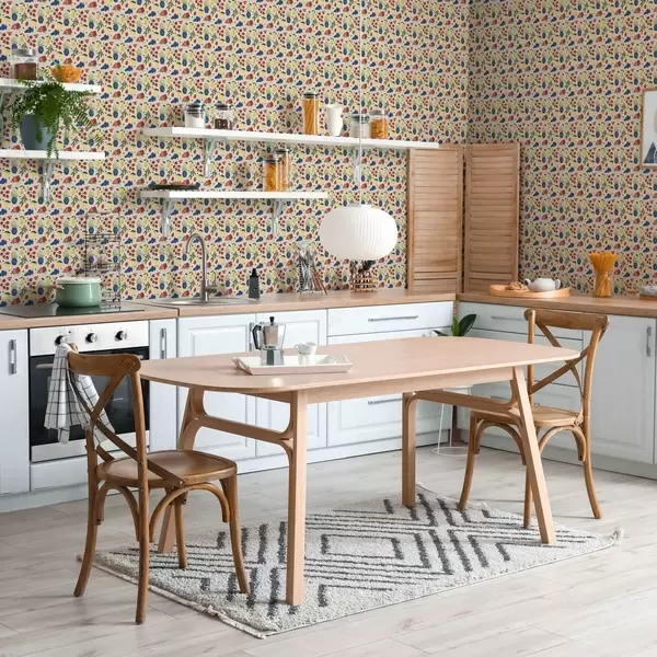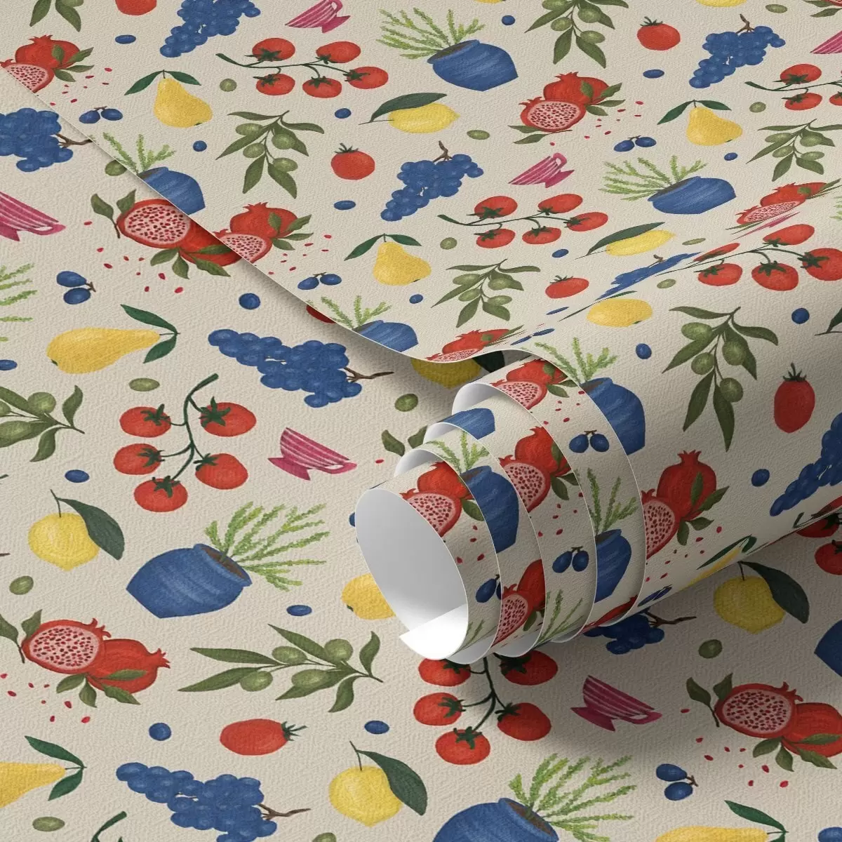 Tapeta Živahen vzorec s sadjem, vejami in vazami Št. a00637