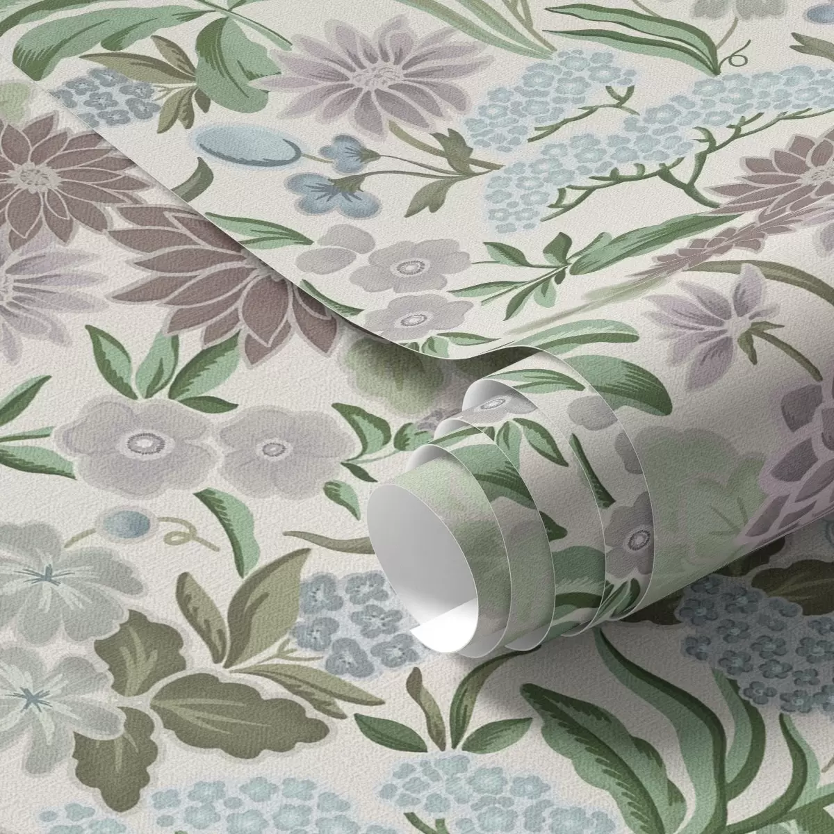 Tapeta Pastelne cvetlice in listje v mint-modri barvni paleti Št. a00642