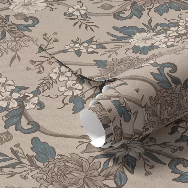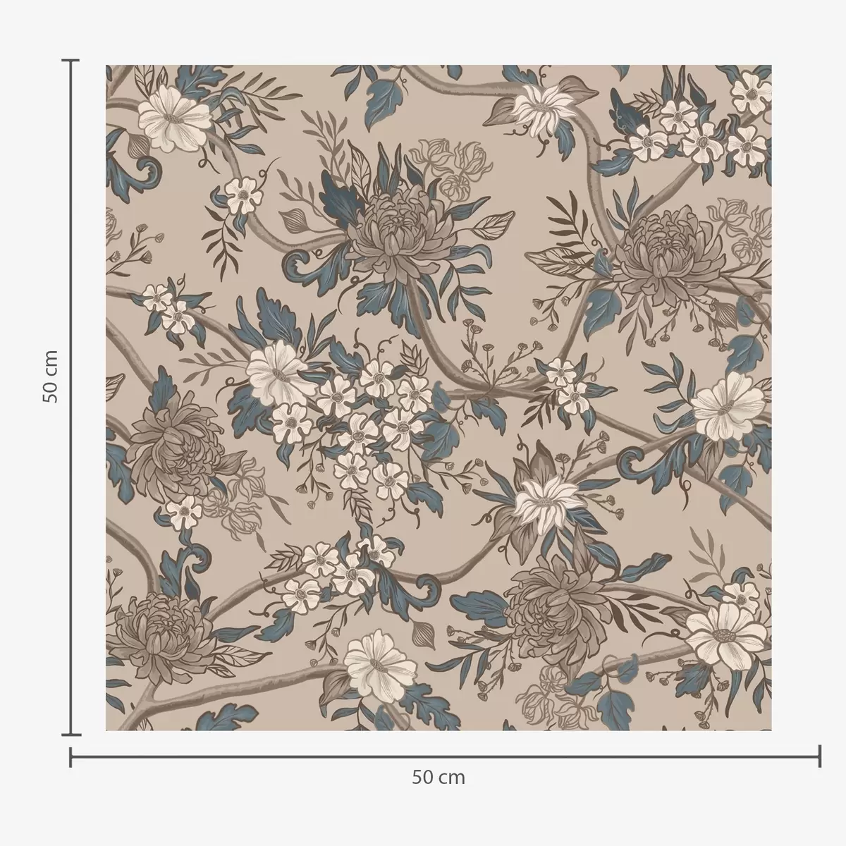 Tapeta Veliki cvetovi z vzorčastimi listi na topli bež barvi ozadja Št. a00649