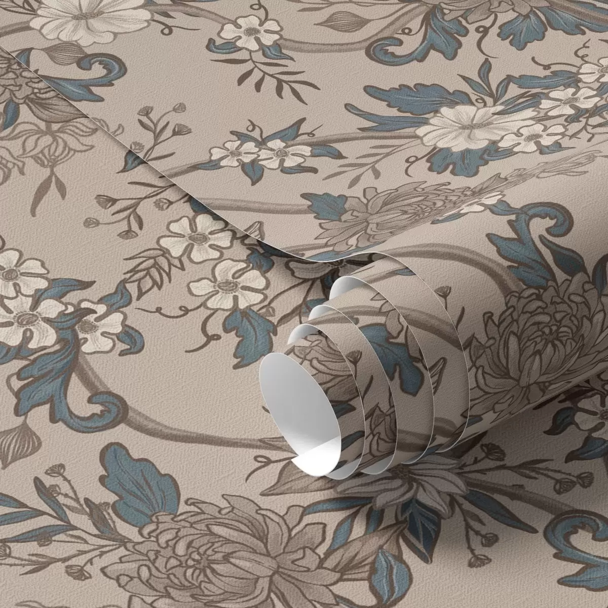 Tapeta Veliki cvetovi z vzorčastimi listi na topli bež barvi ozadja Št. a00649