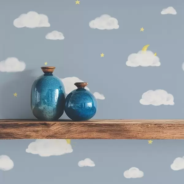 Tapeta Mehki oblaki, zvezde in sonce na modrem ozadju Št. a00652
