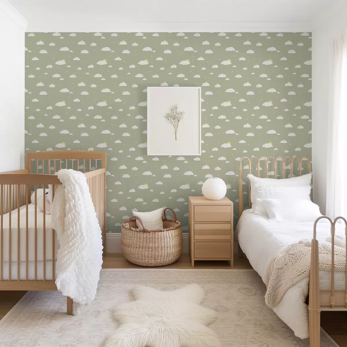 Tapeta Mehki oblaki, zvezde in sonce na zelenkasto sivem ozadju Št. a00652v1