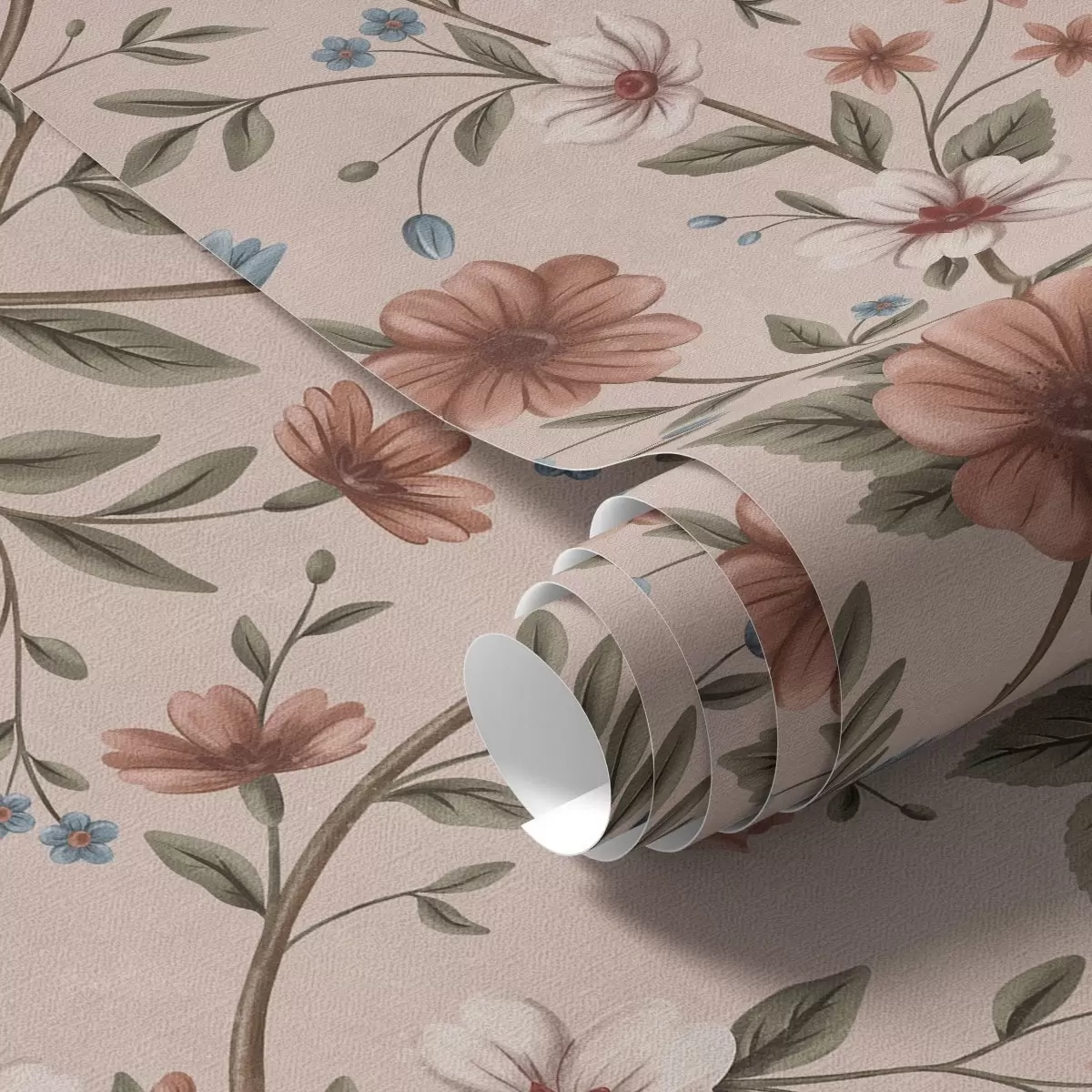 Tapeta Rožnato-koralne cvetove in listje na prašno rožnati podlagi Št. a00667