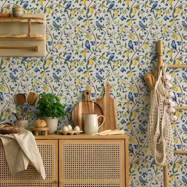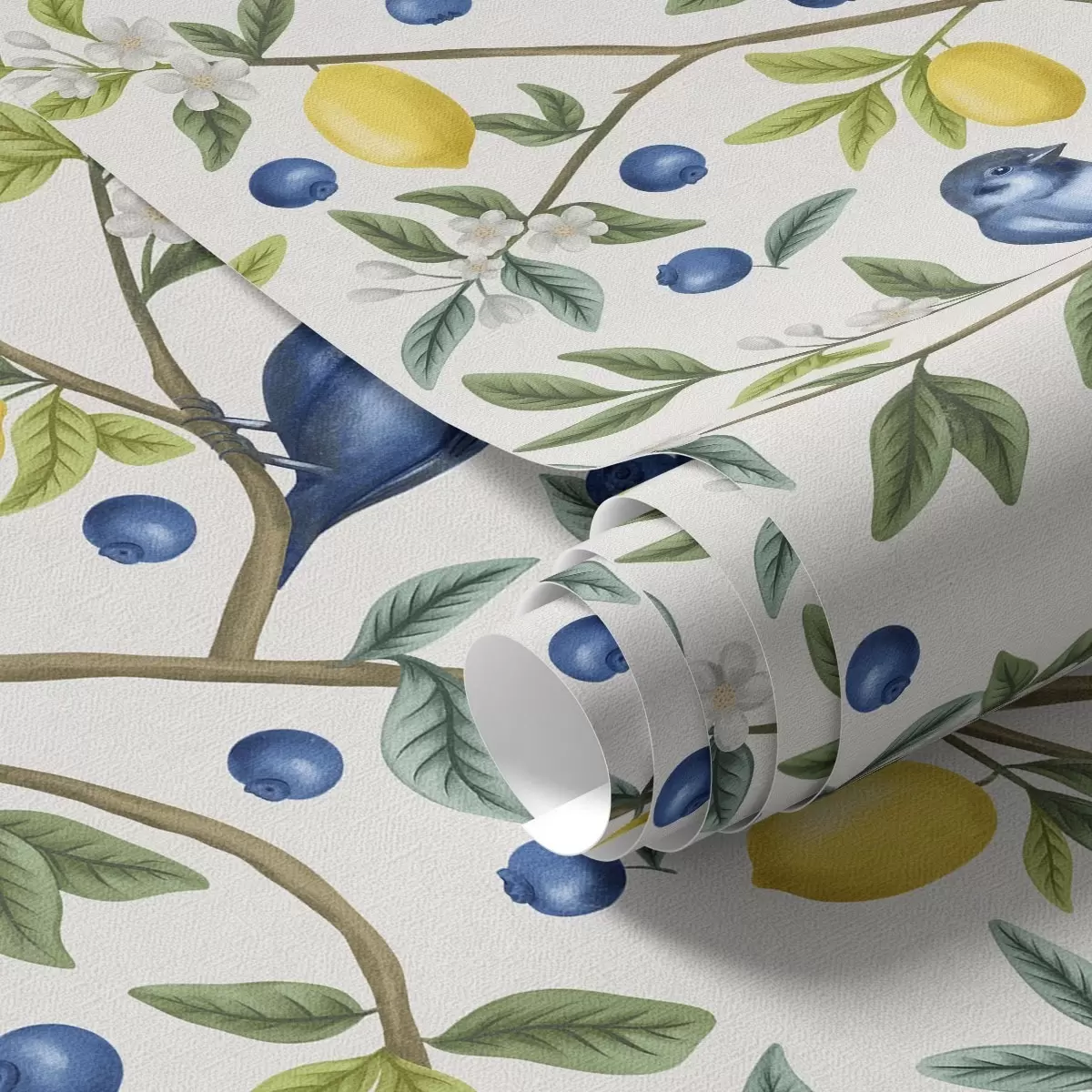 Tapeta Modre ptice, limone in jagode na belem ozadju Št. a00668