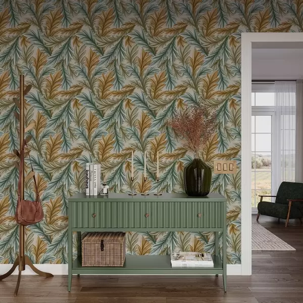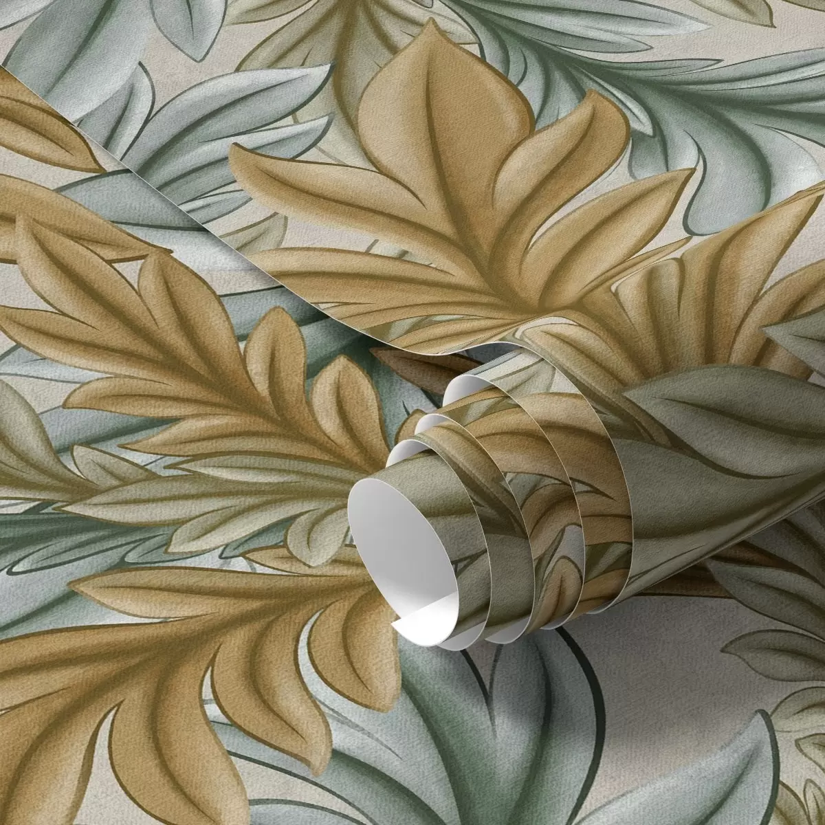Tapeta Dekorativno listje v topli paleti okra in zelene barve Št. a00673