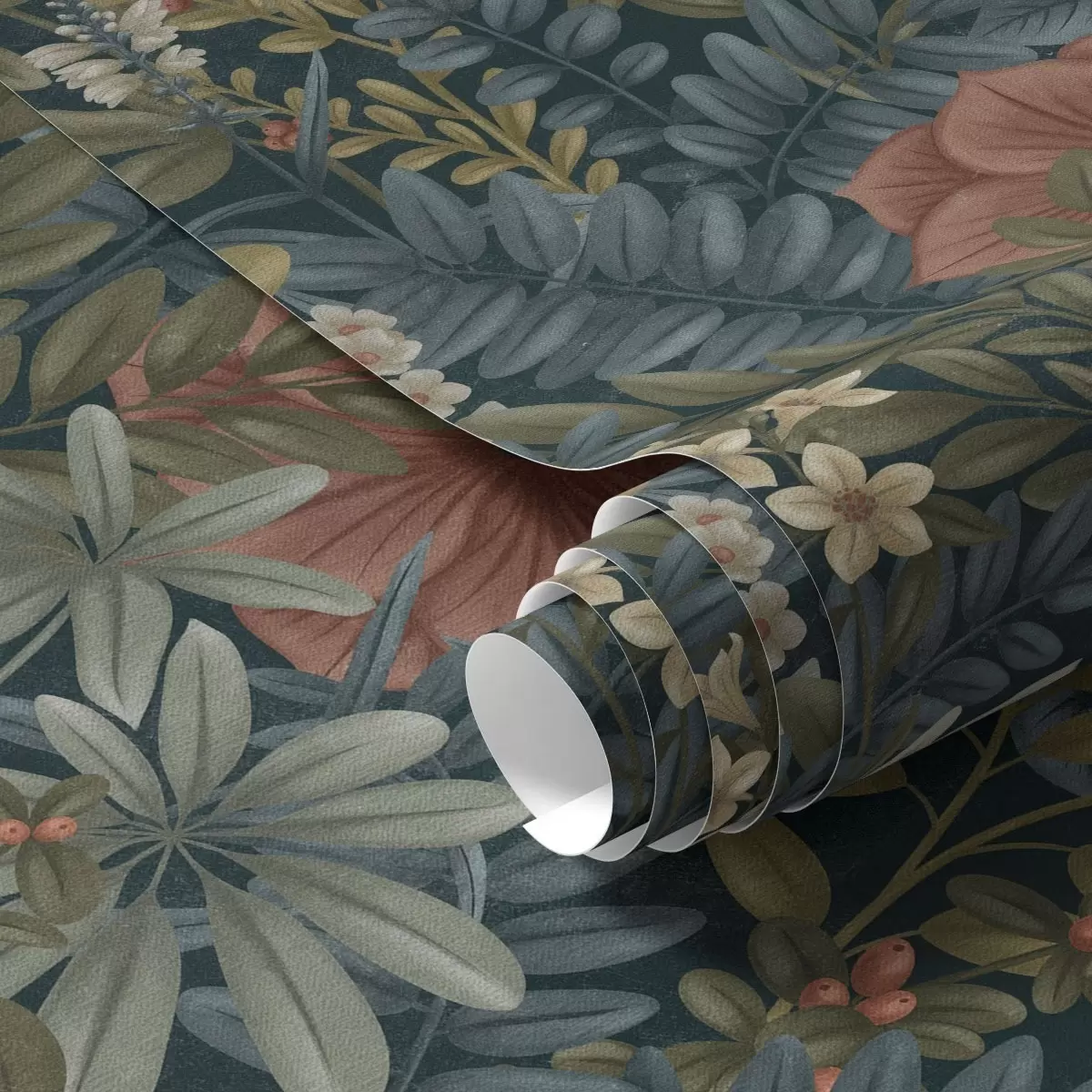 Tapeta Temno ozadje z gostimi cvetovi in listi v toplih barvah Št. a00678