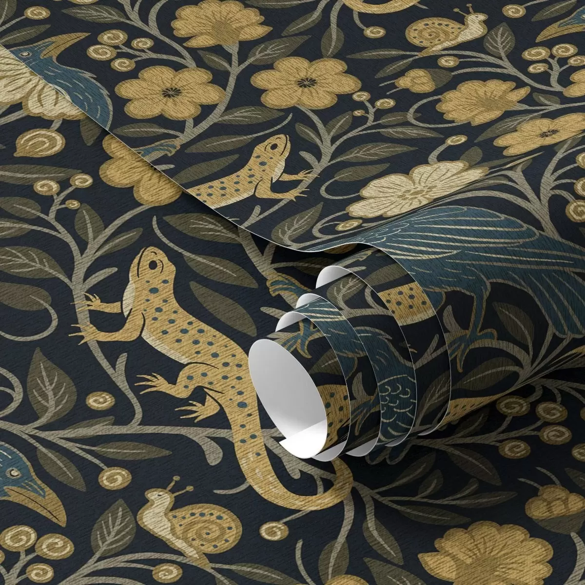 Tapeta Ptice, kuščarji in polži med cvetovi na temnem ozadju Št. a00691
