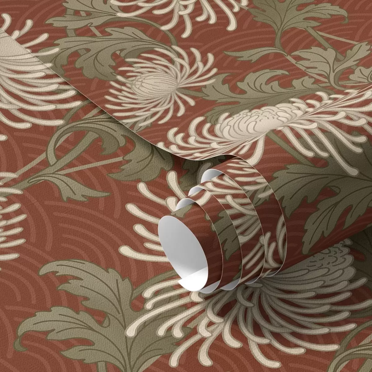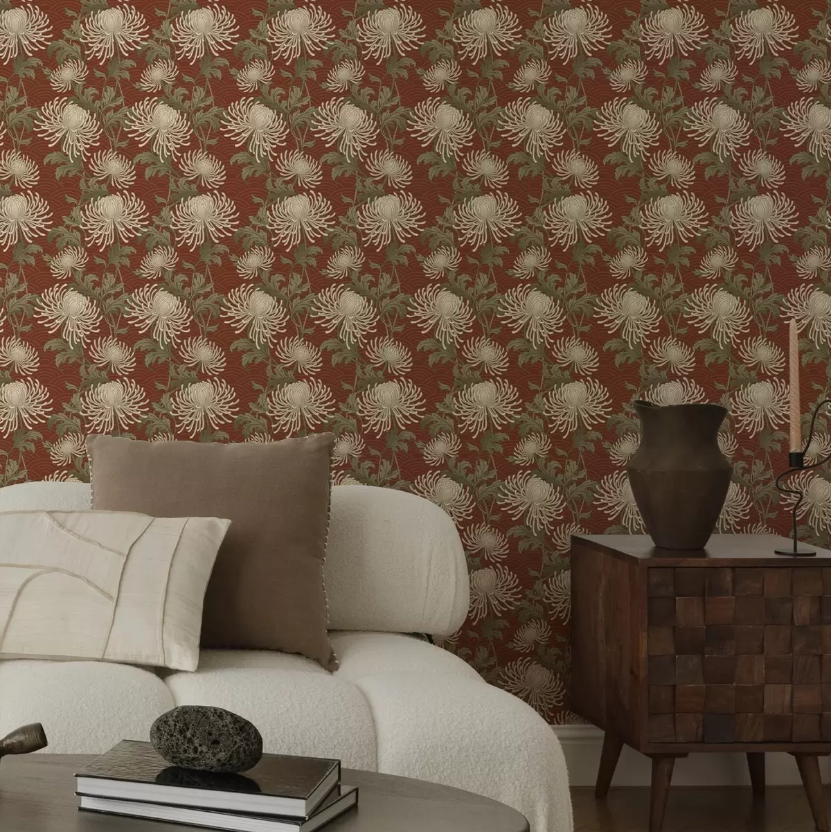 Tapeta Kremaste krizanteme na terakotnem ozadju, azijski slog Št. a00693