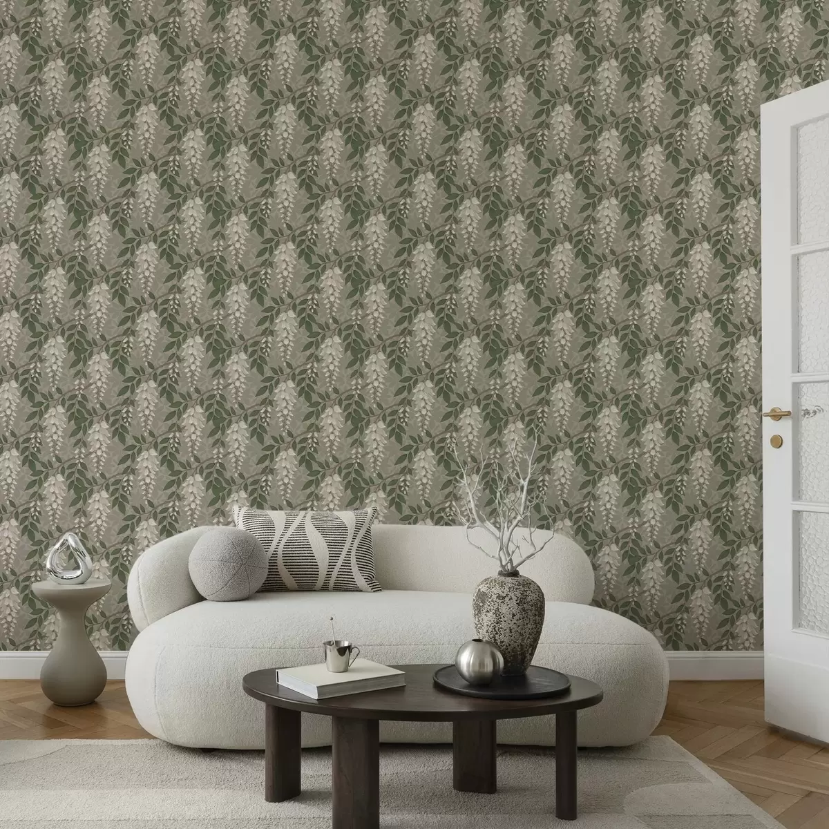 Tapeta Svetla glicinija na sivo-olivnem ozadju, padajoči grozdi Št. a00694