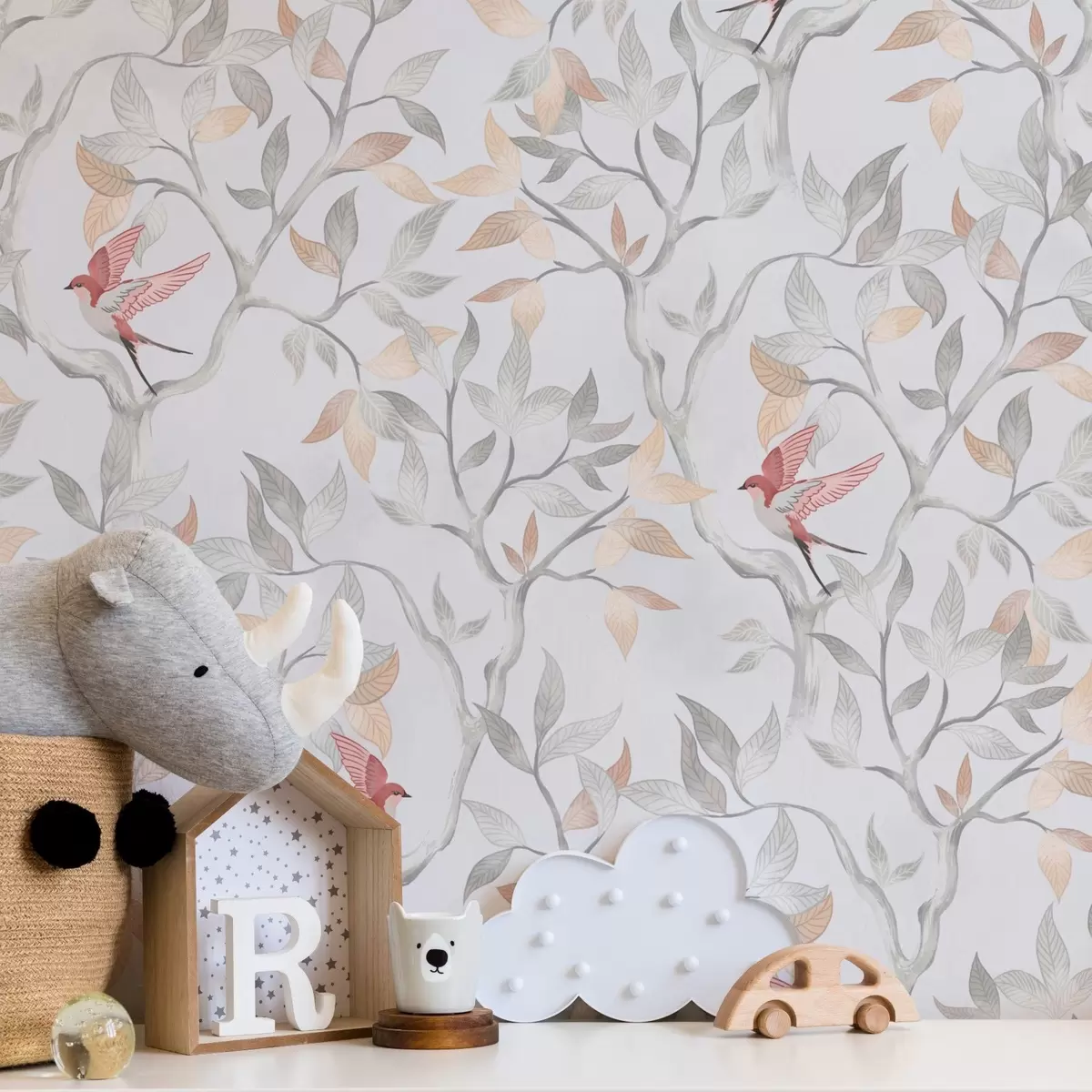 Tapeta Svetle veje z listi in pticami v odtenkih breskve Št. a00716