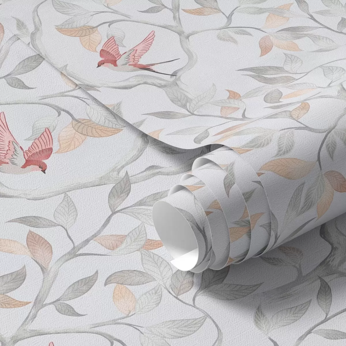 Tapeta Svetle veje z listi in pticami v odtenkih breskve Št. a00716