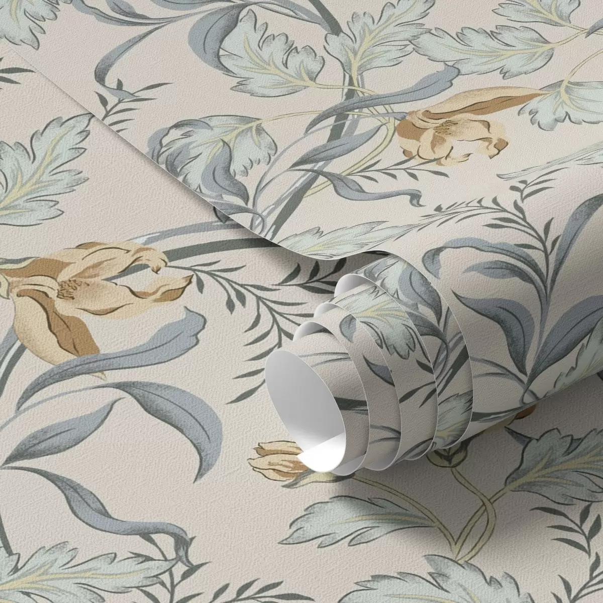 Tapeta Vintage cvetje z modrim listjem na kremastem ozadju Št. a00717