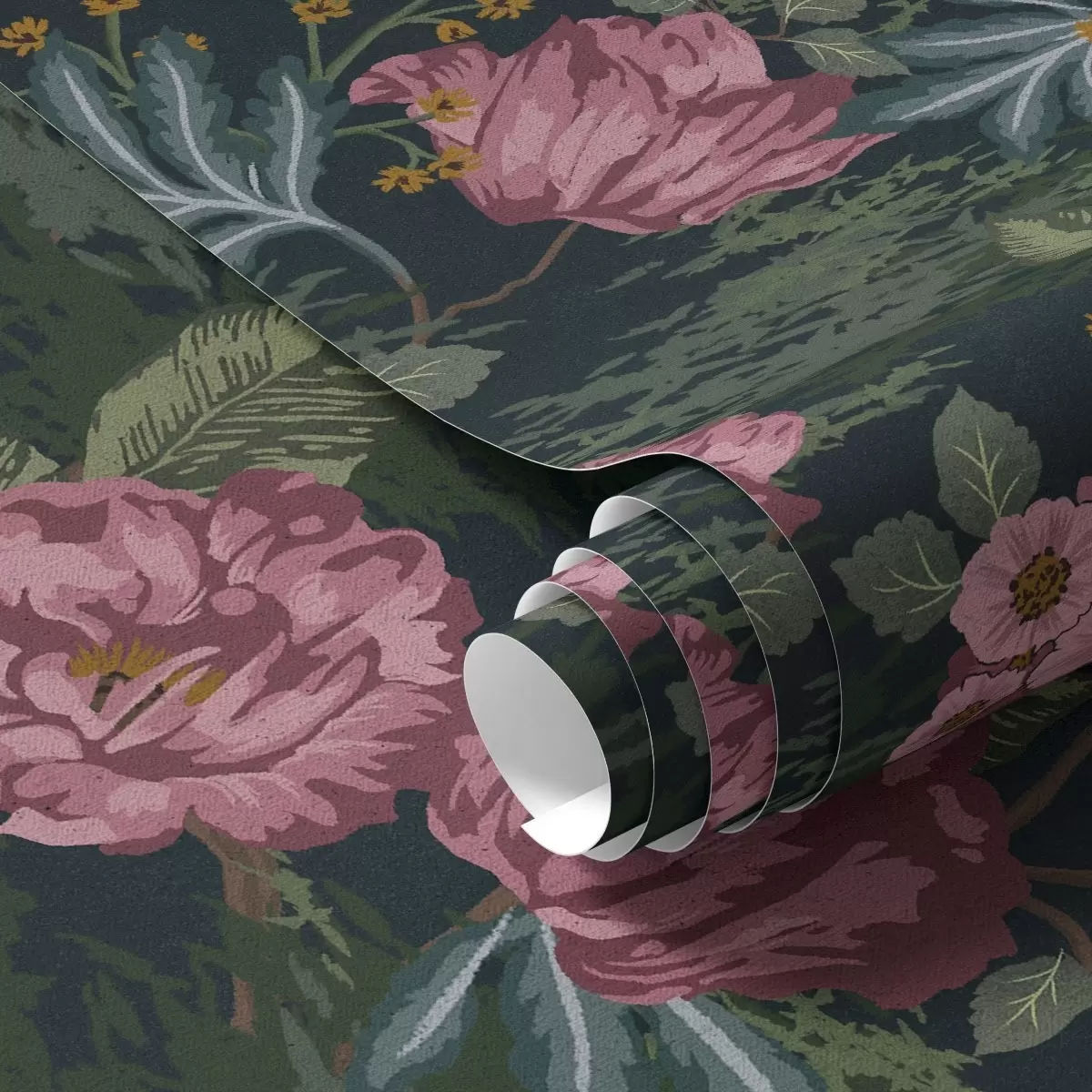 Tapeta Temna flora z rožnatimi cvetovi in listi, temno ozadje Št. a00724