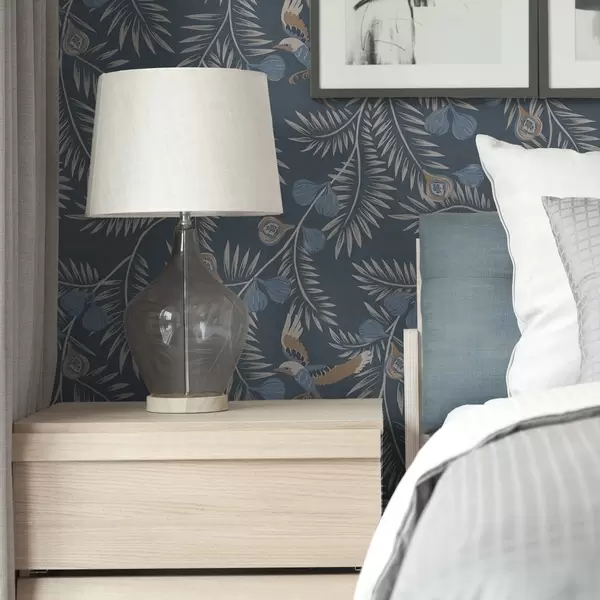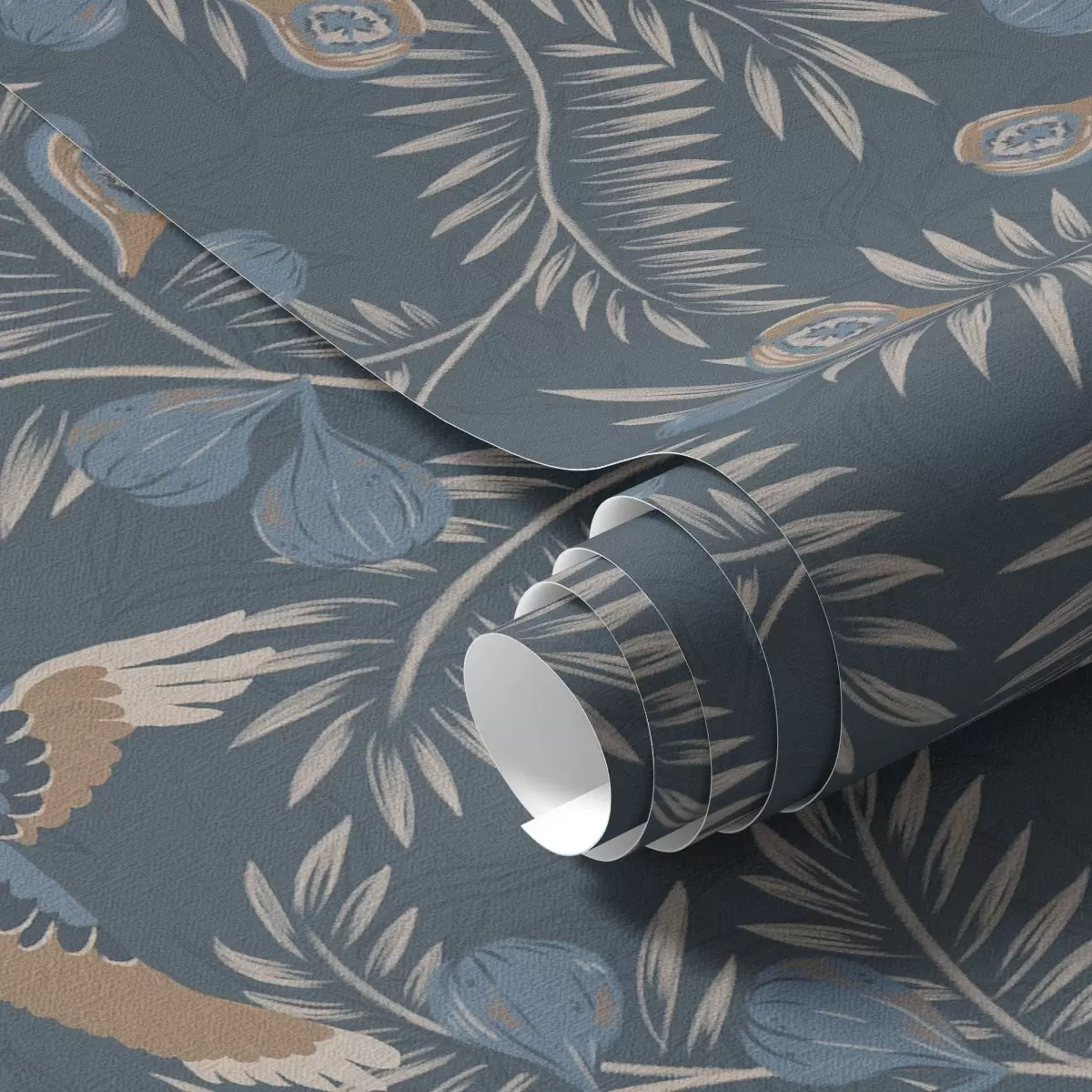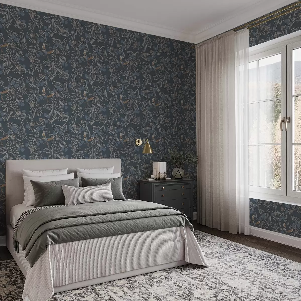 Tapeta Ptica med modrimi plodovi in palmovimi listi, indigo Št. a00726