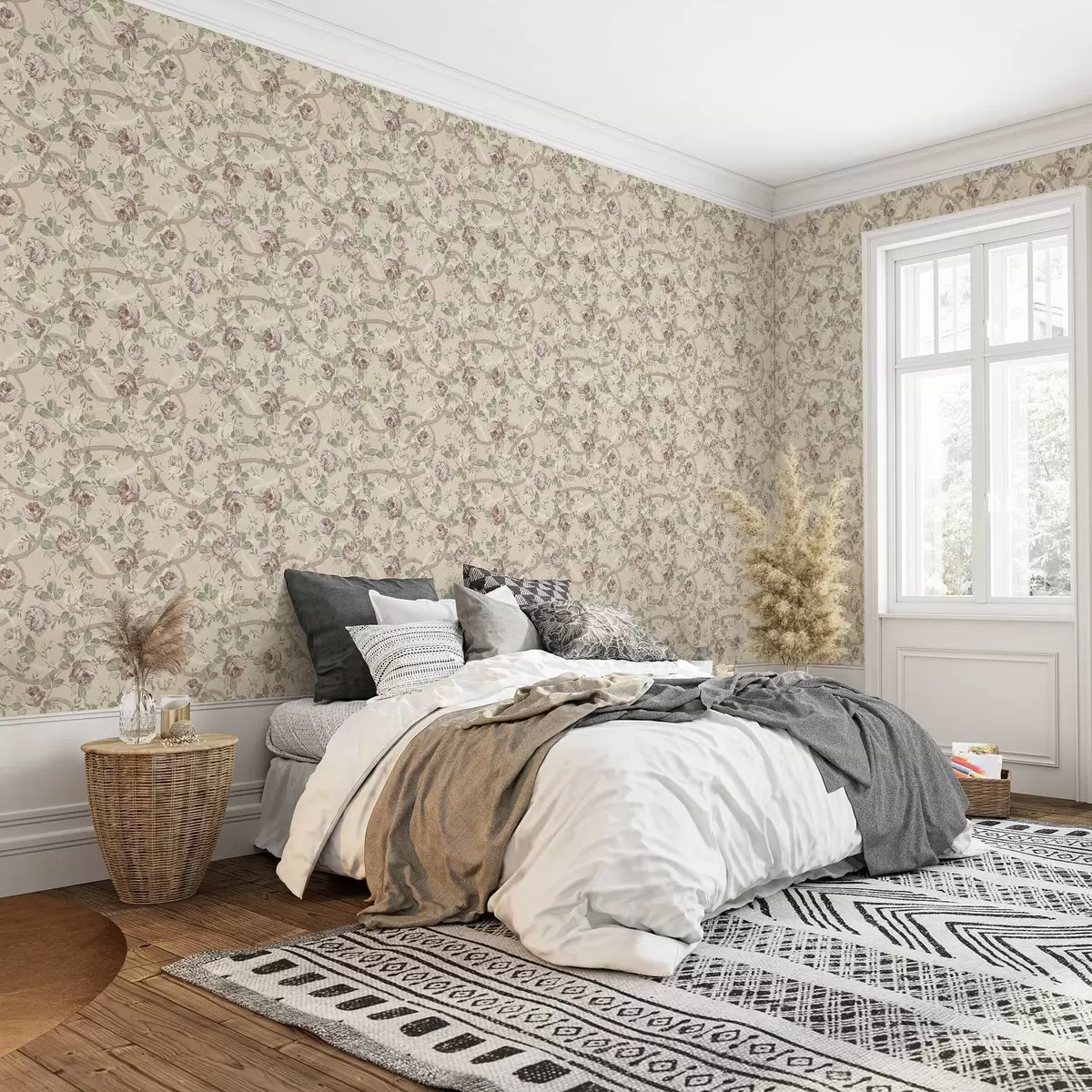 Tapeta Vrtnice z zelenimi listi na topli bež podlagi Št. a00729