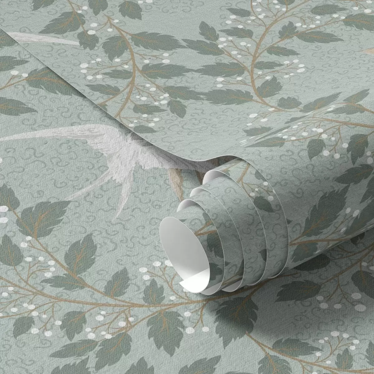 Tapeta Vejice z belimi jagodami in pticami na zelenem ozadju Št. a00731