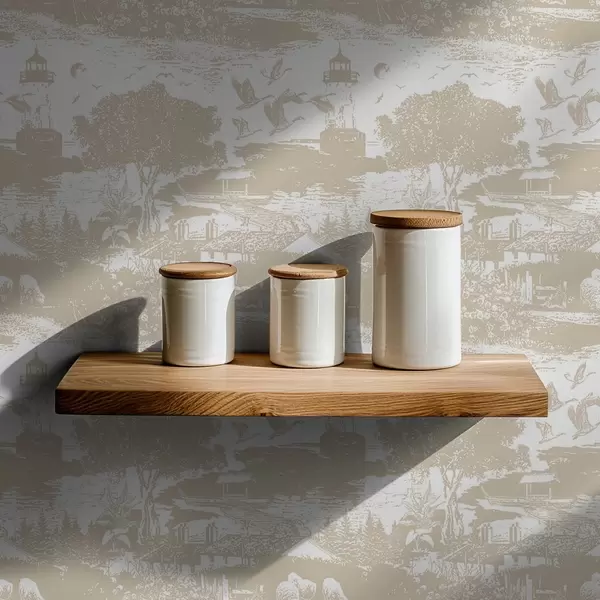 Tapeta Prizor z majakom, drevesi in hišami v sieni Št. a00739