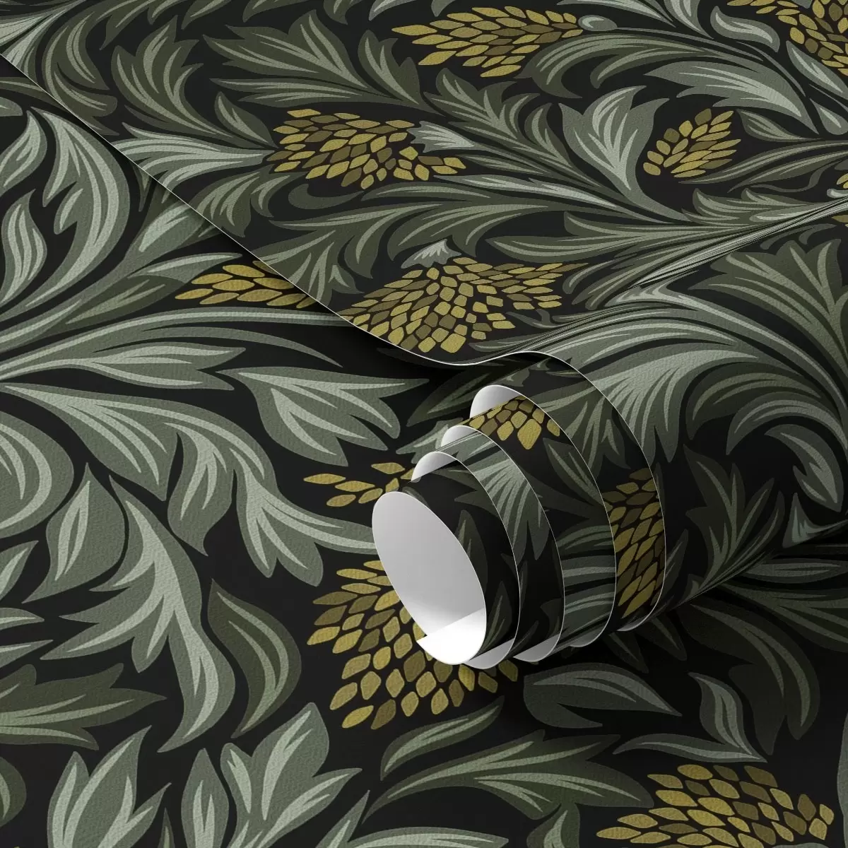 Tapeta Temni listi akanta z rumenimi stožci na črnem ozadju Št. a00745