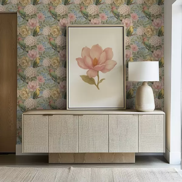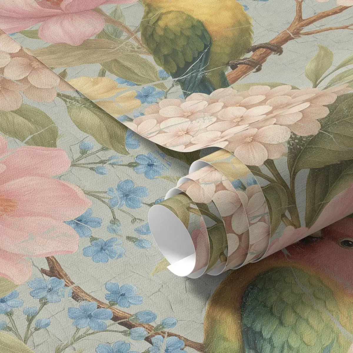Tapeta Papige med potonikami, hortenzijami in magnolijami Št. a00747
