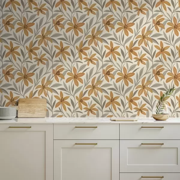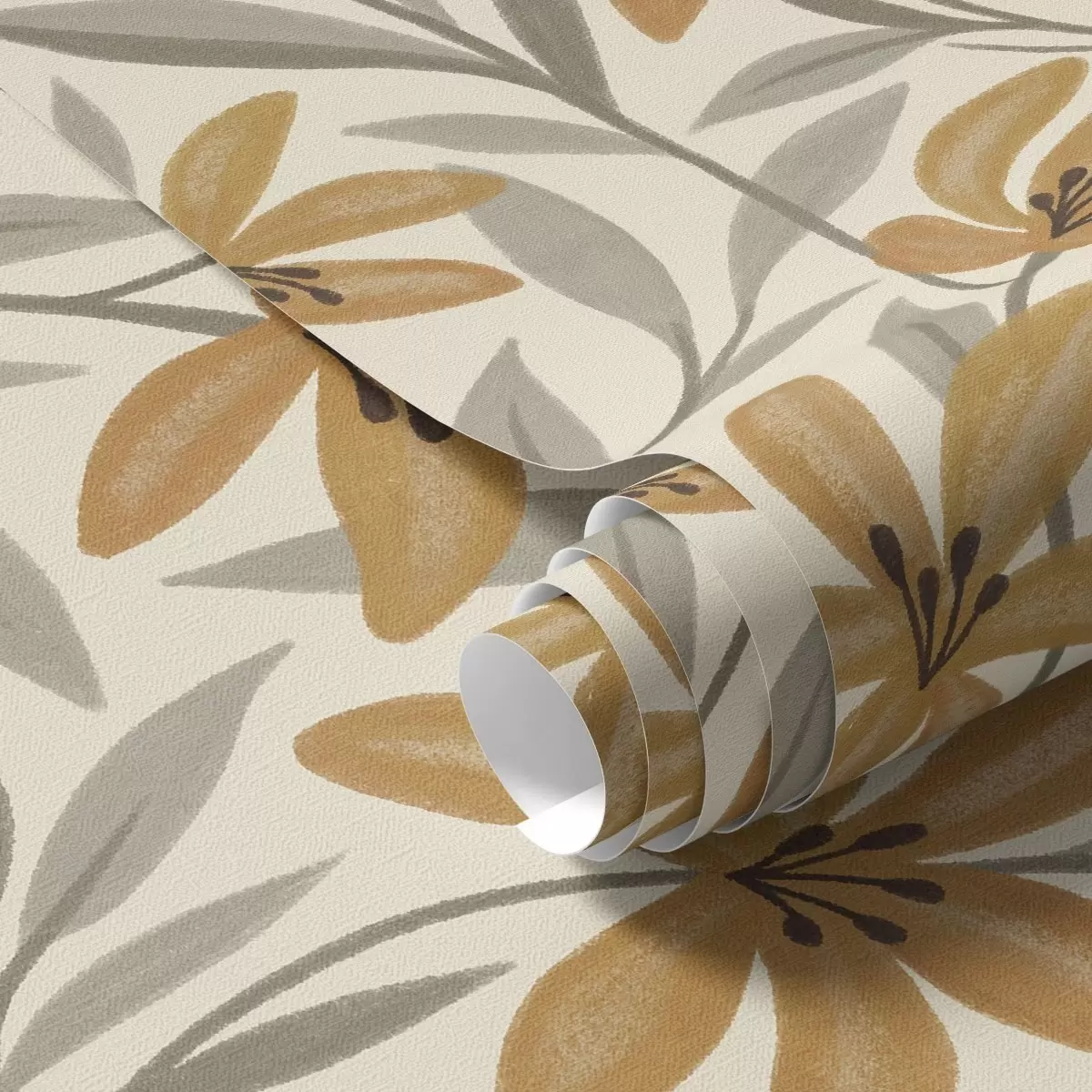Tapeta Rumene lilije in sivo-zelene liste na svetlem ozadju Št. a00757