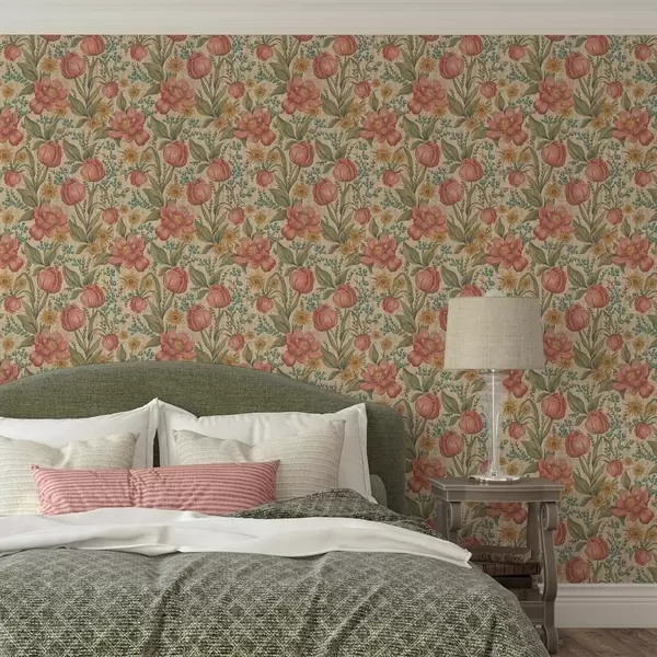 Tapeta Vintage tulipani in astre, teksturirano kremasto ozadje Št. a00773