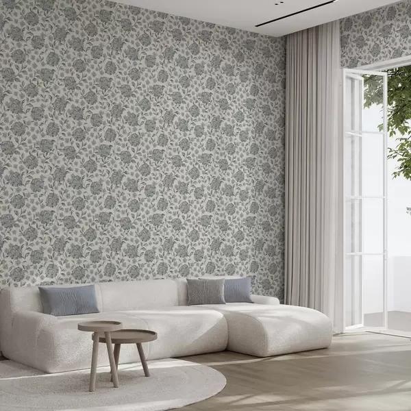 Tapeta Goste cvetove in liste v sivo-modri barvni paleti Št. a00778