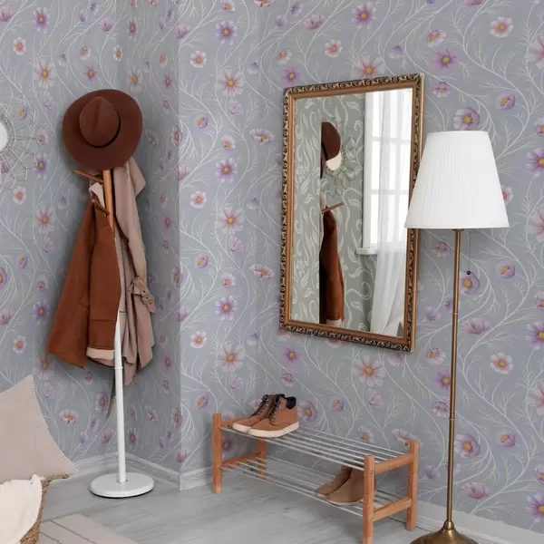 Tapeta Rožnati kozmos in vitki stebli na sivem ozadju Št. a00791