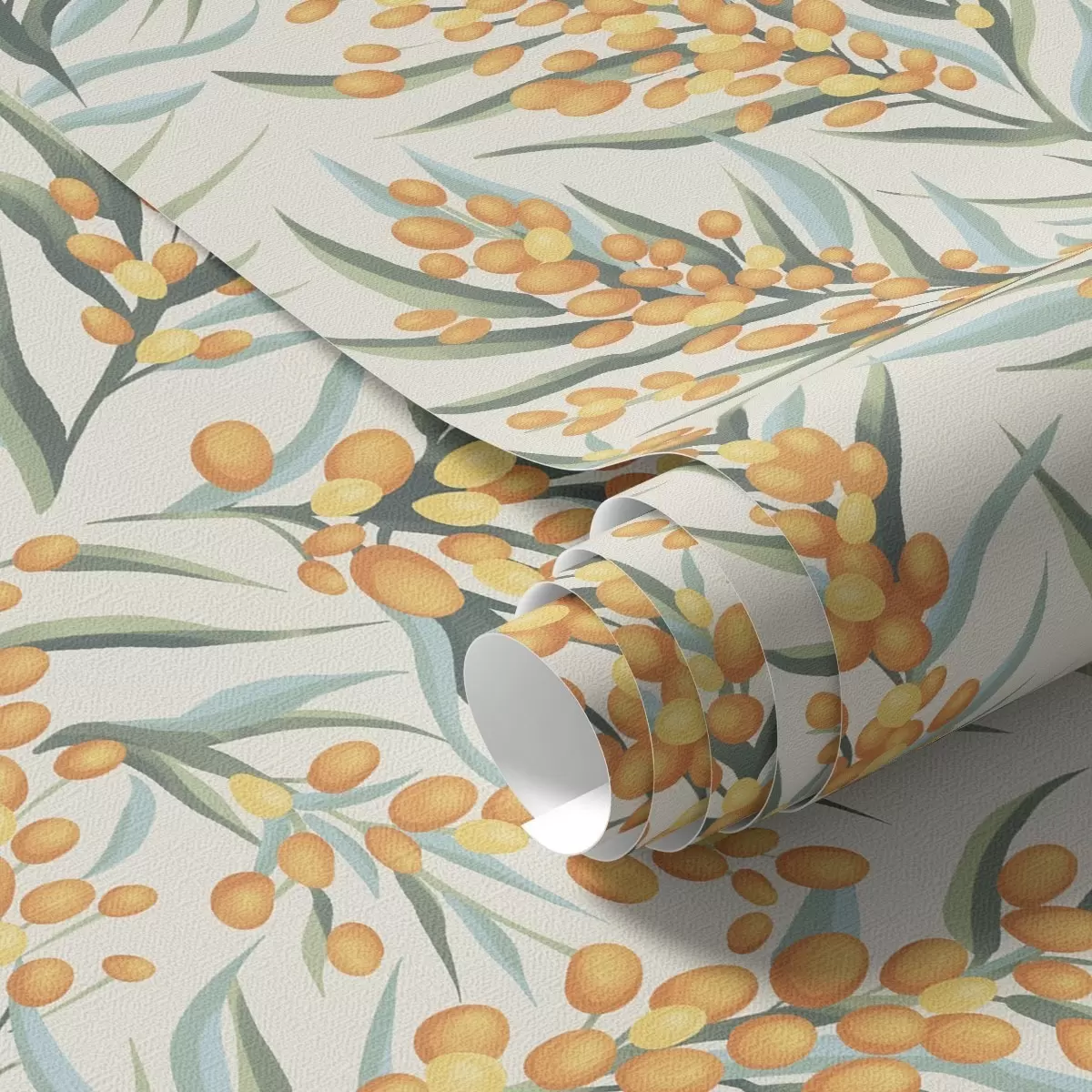 Tapeta Veje rakitovca z oranžnimi jagodami, svetlo ozadje Št. a00792