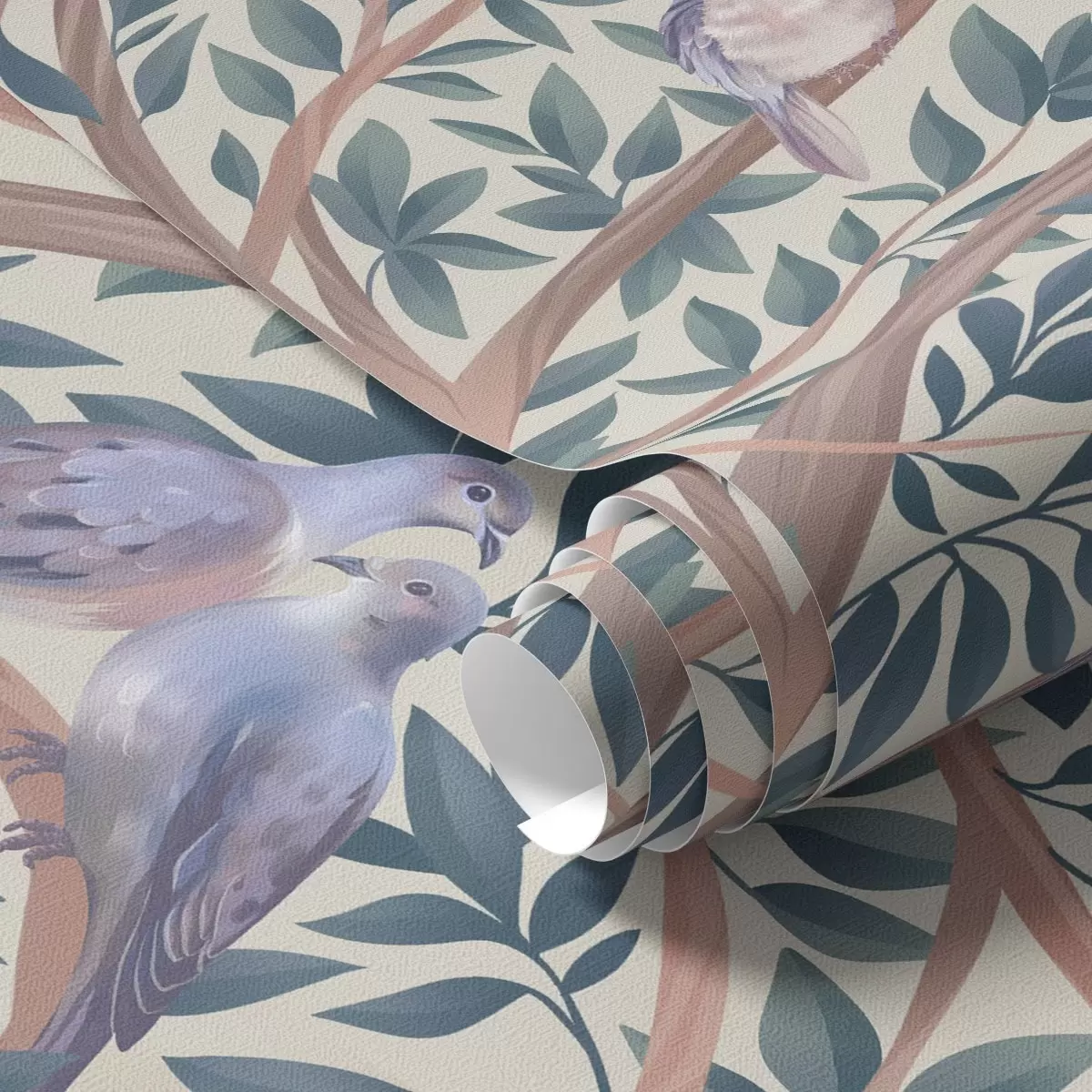 Tapeta Golobi med vejami in listi v nežni pastelnih barvah Št. a00796