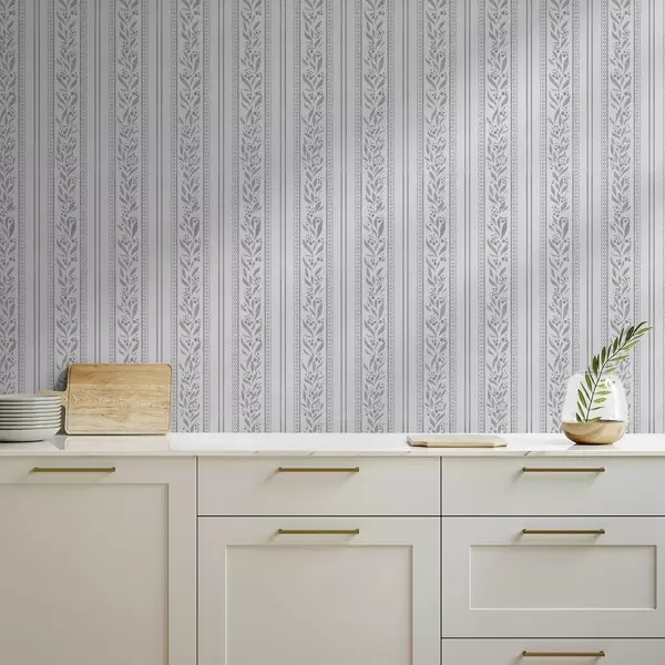 Tapeta Črte s čipko in vejicami na hladni beli barvi Št. a00814v1