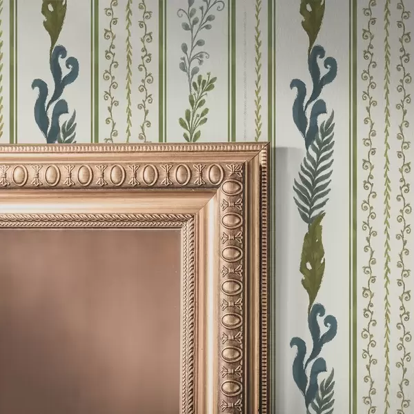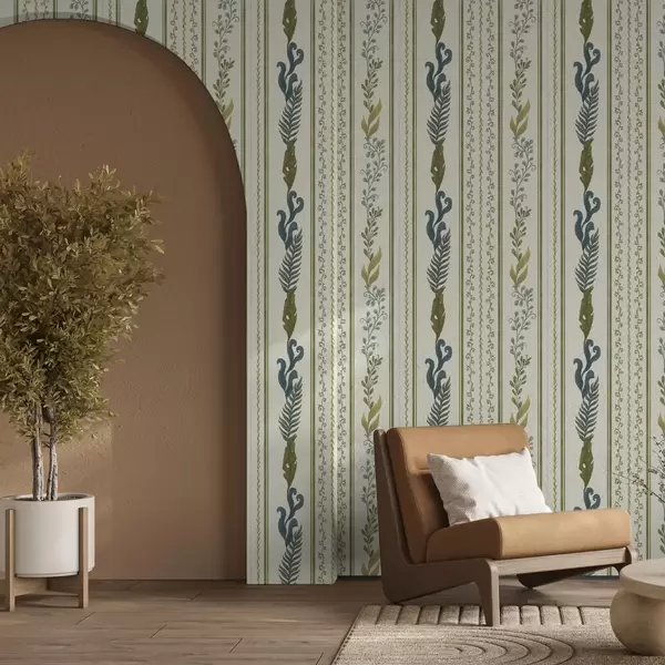 Tapeta Črte z okraski v obliki zvitkov in velikimi vejami v zelenih barvah Št. a00823