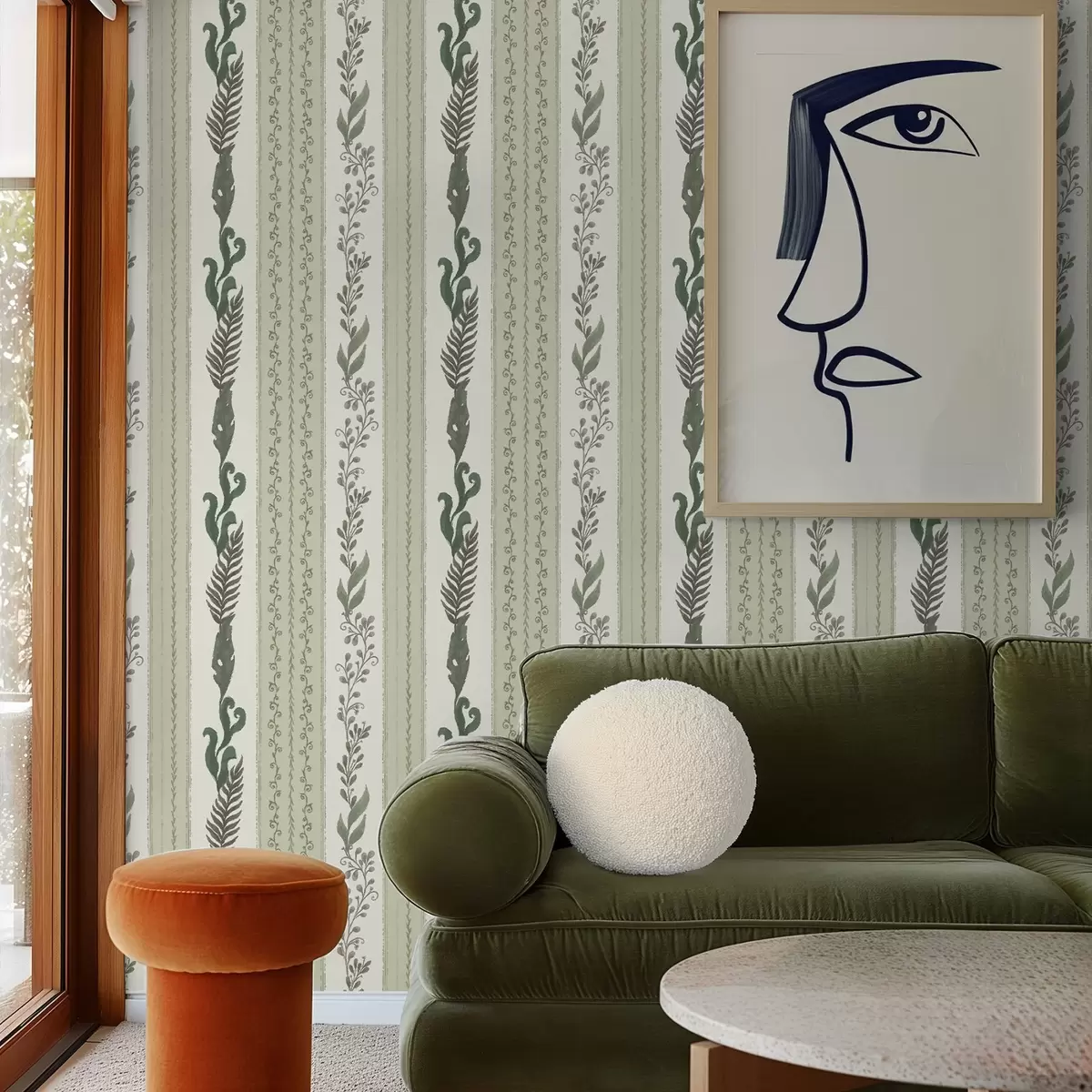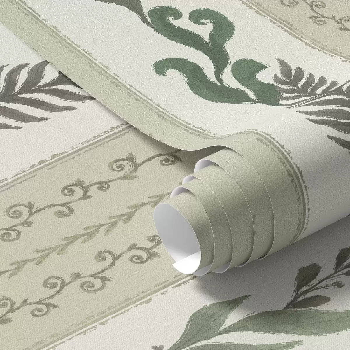 Tapeta Črte z vejami v zelenih in sivih odtenkih, mehak kontrast Št. a00824