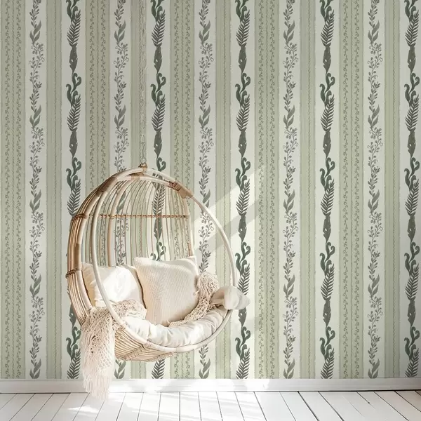 Tapeta Črte z vejami v zelenih in sivih odtenkih, mehak kontrast Št. a00824