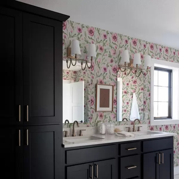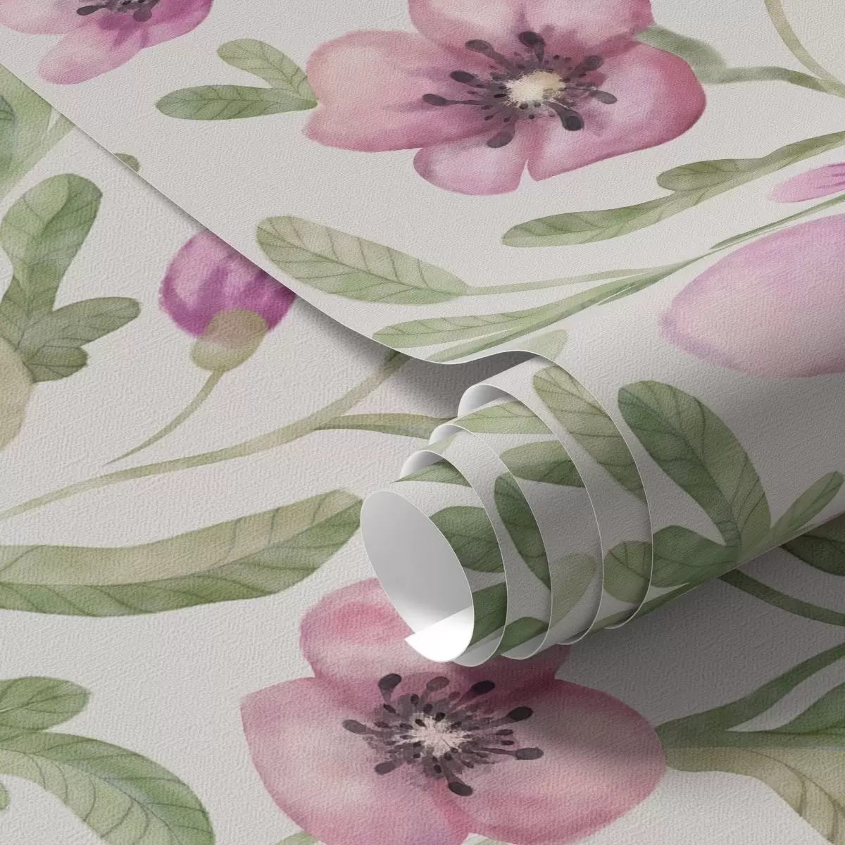 Tapeta Nežni rožnati makovi cvetovi z listi, naslikani v akvarelni tehniki Št. a00830
