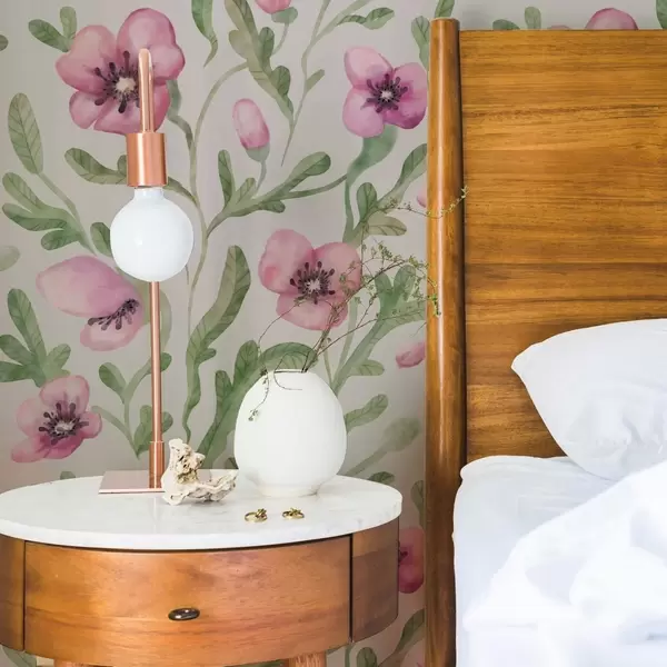 Tapeta Nežni rožnati makovi cvetovi z listi, naslikani v akvarelni tehniki Št. a00830