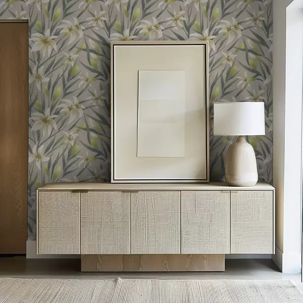 Tapeta Kremaste lilije z listi na sivo-bežnem ozadju Št. a00837