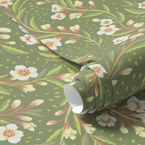 Tapeta Veje s kremastimi cvetovi na olivnem ozadju Št. a00850