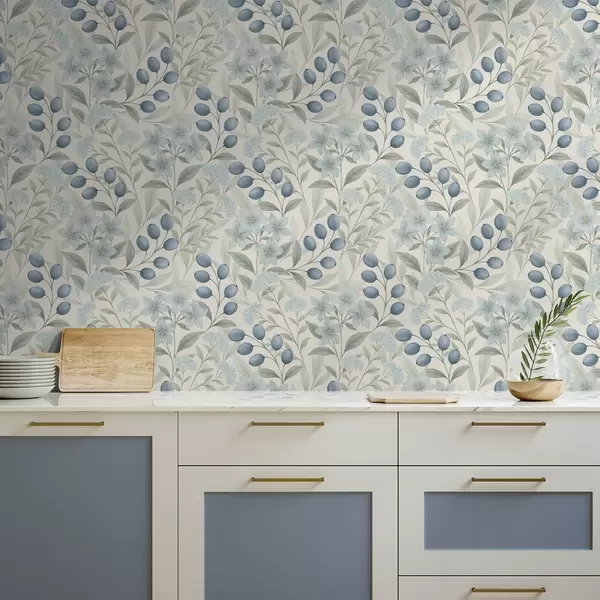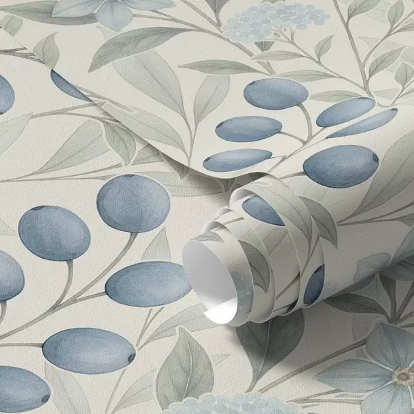 Tapeta Modre jagode in svetli cvetovi na slonokoščeni podlagi Št. a00872