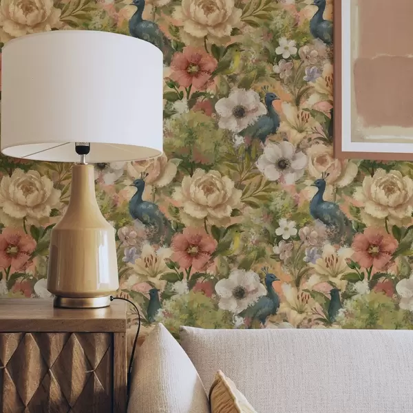 Tapeta Slikarski vrt s pavji in velikimi cvetovi Št. a00885
