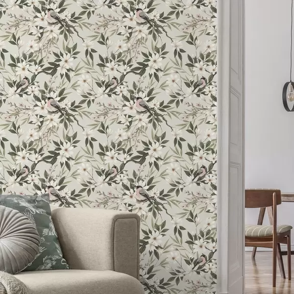 Tapeta Škrjanci z belimi prsmi na vejah s kremastimi cvetovi Št. a00889