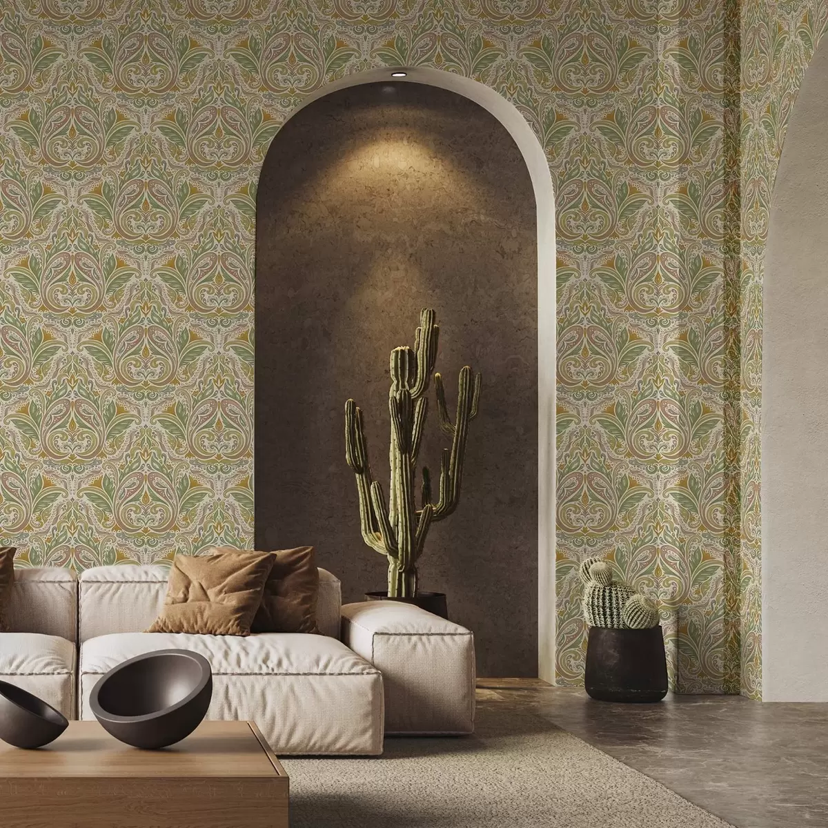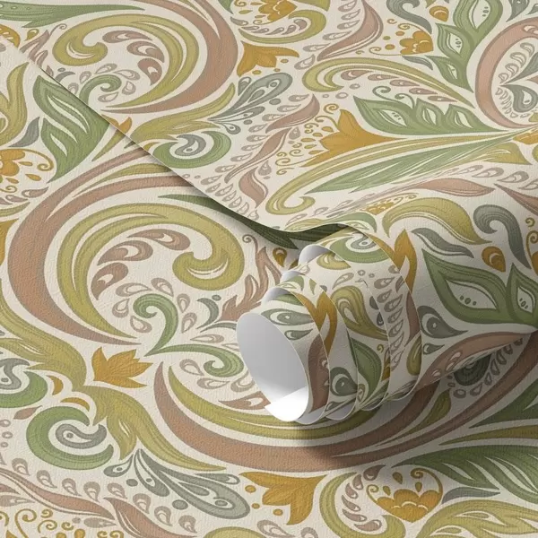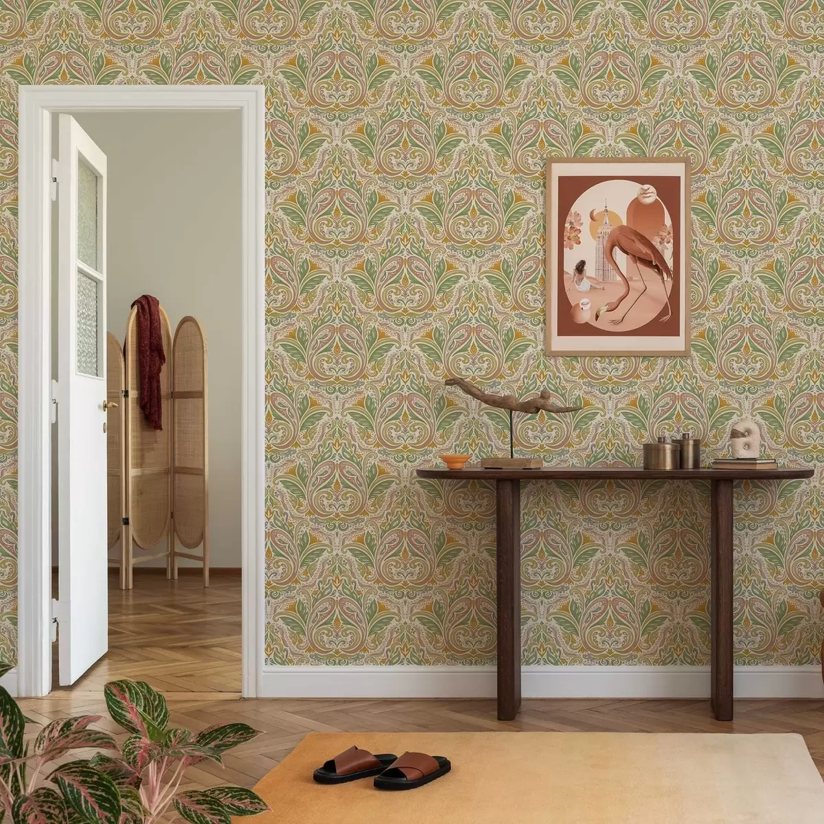 Tapeta Okrasni listnati vrtinci v zelenih in terakotnih odtenkih Št. a00927v1