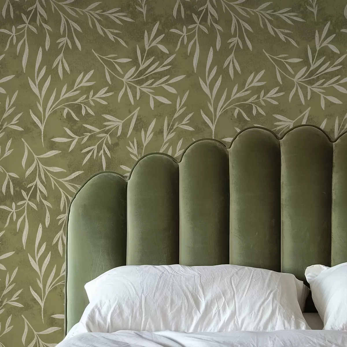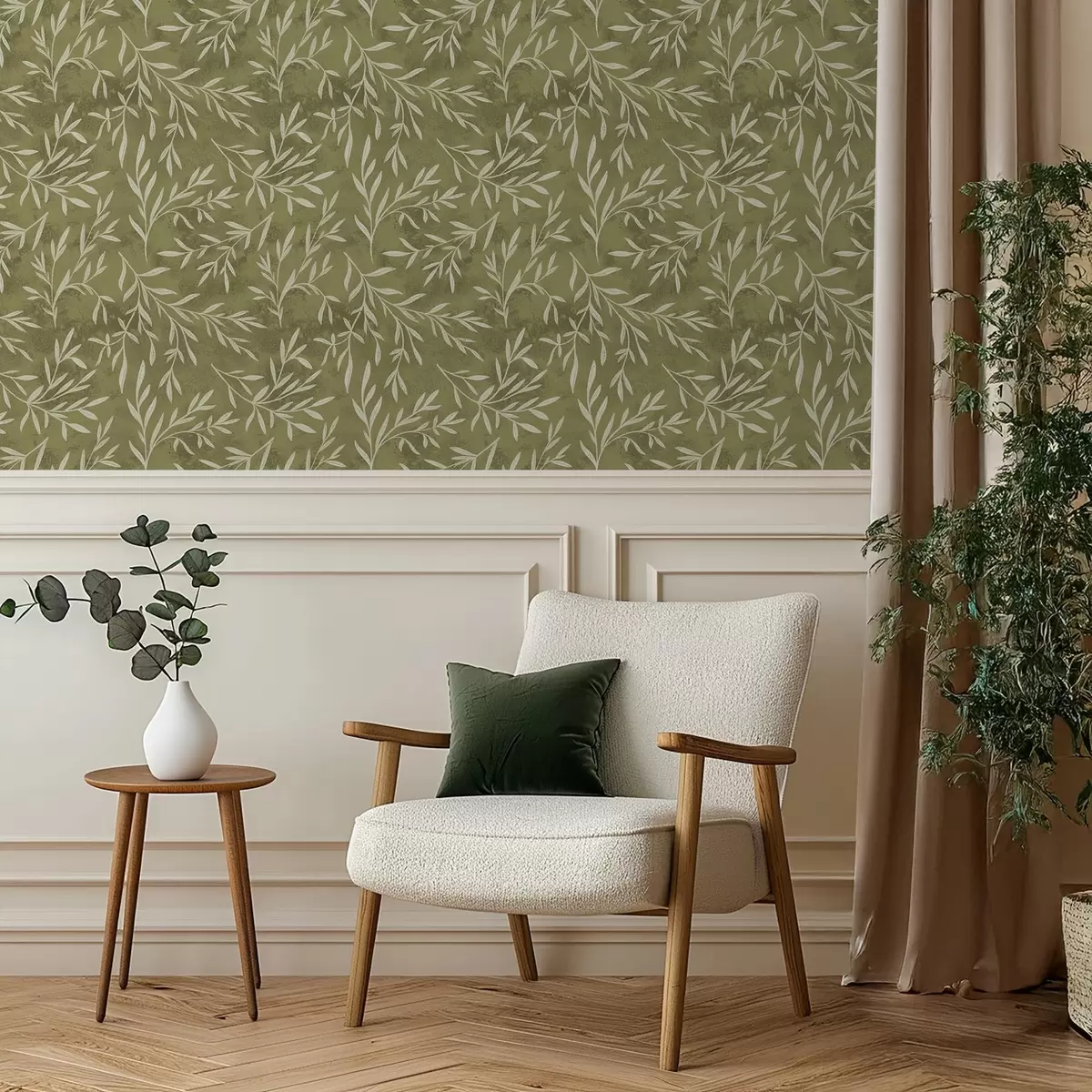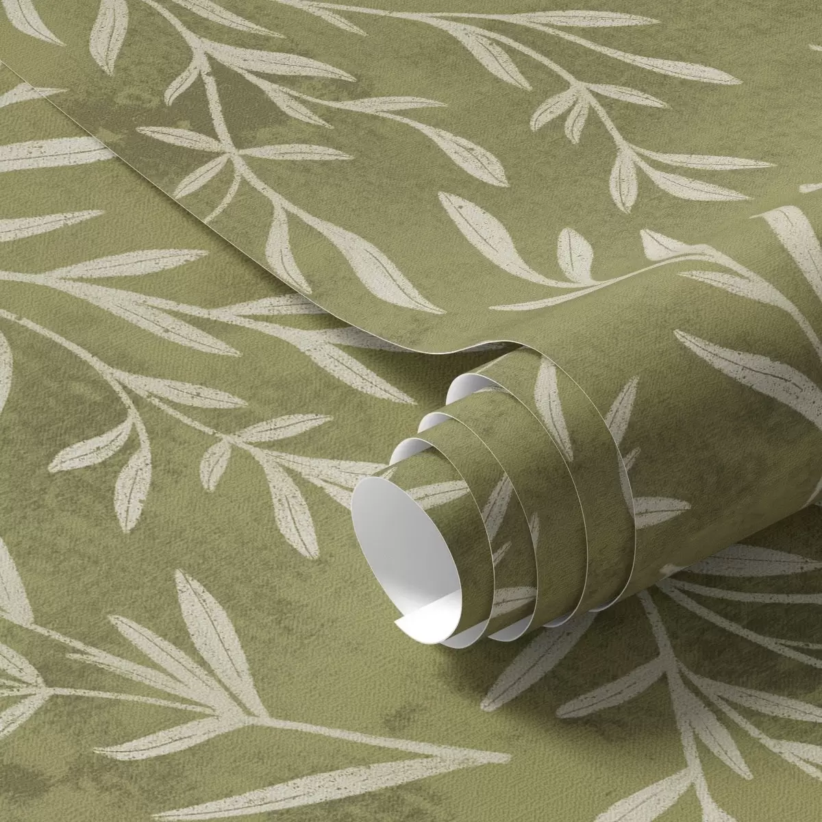 Tapeta Kremno bele vejice na topli olivni teksturirani podlagi Št. a00936v1