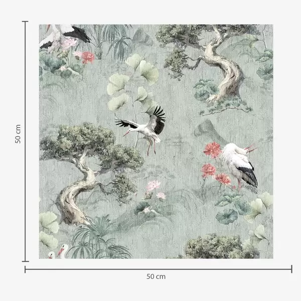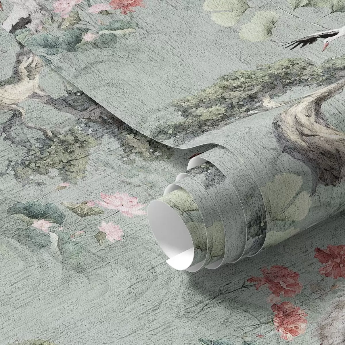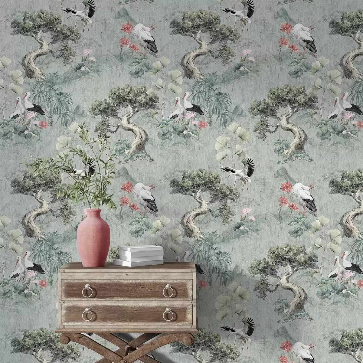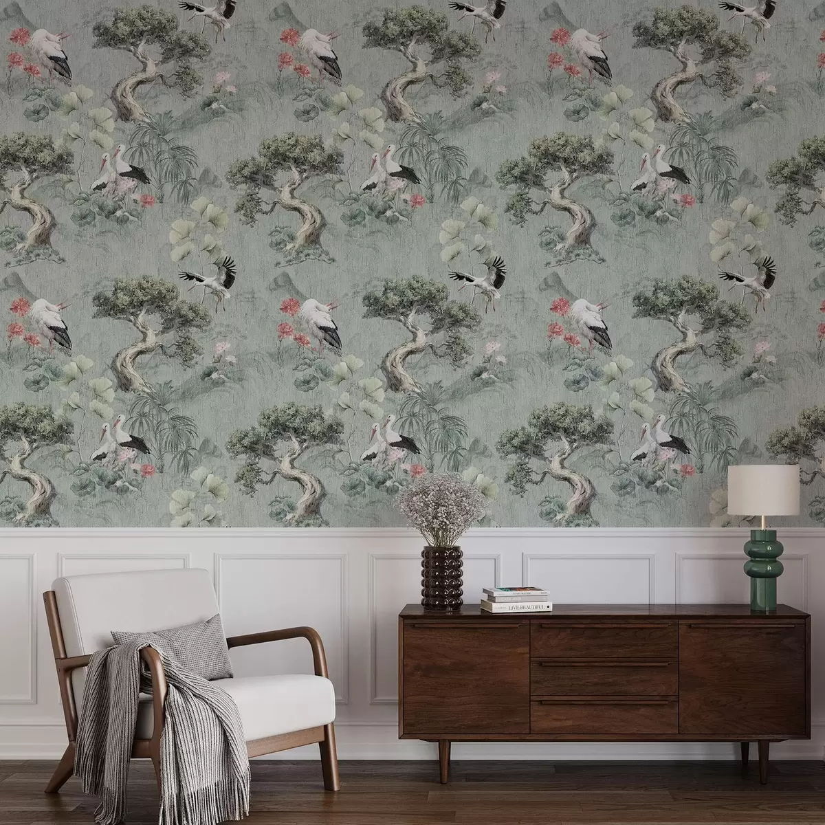 Tapeta Žerjavi med borovci in lotusi na mirnem zelenem ozadju Št. a00962