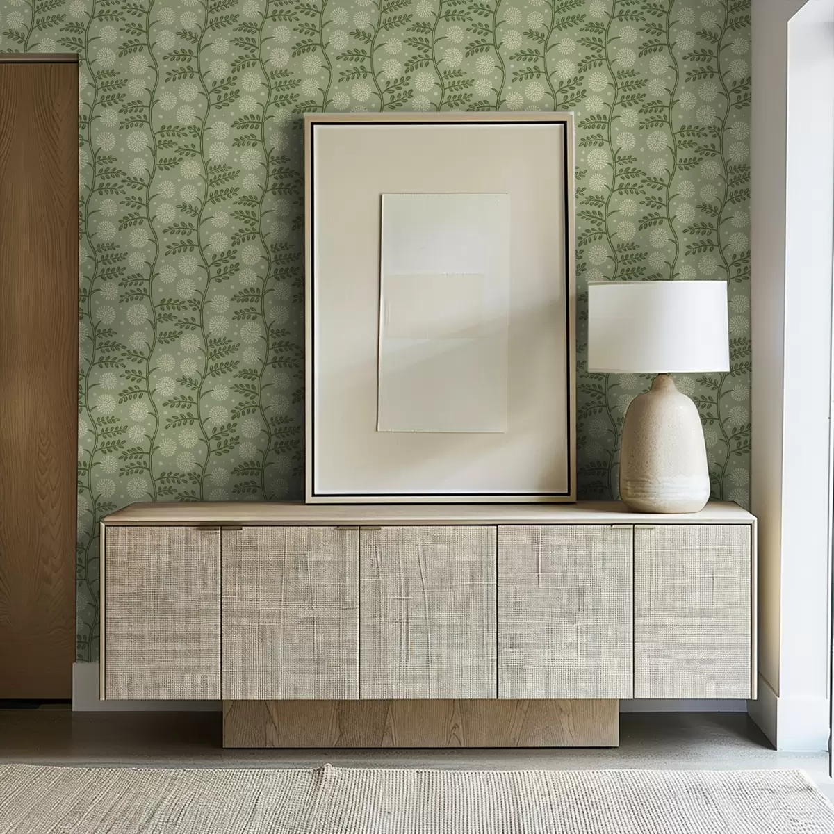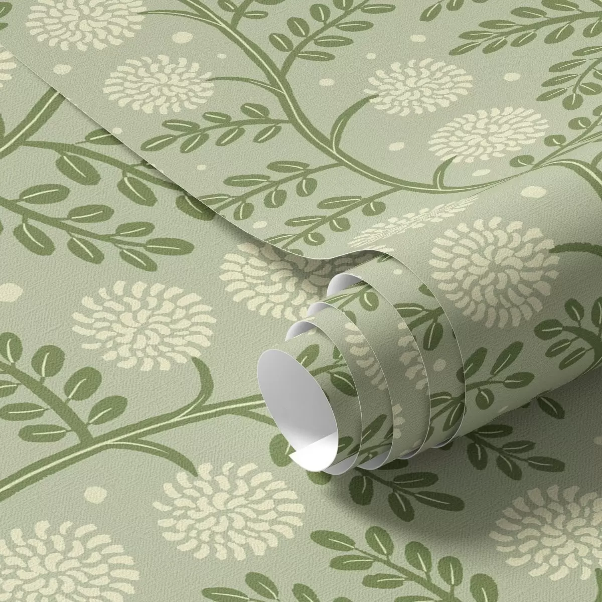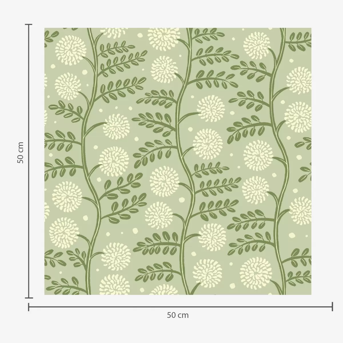 Tapeta Sage-zeleni stebli s slonokoščenimi puhastimi cvetovi in pikami Št. a00997v2